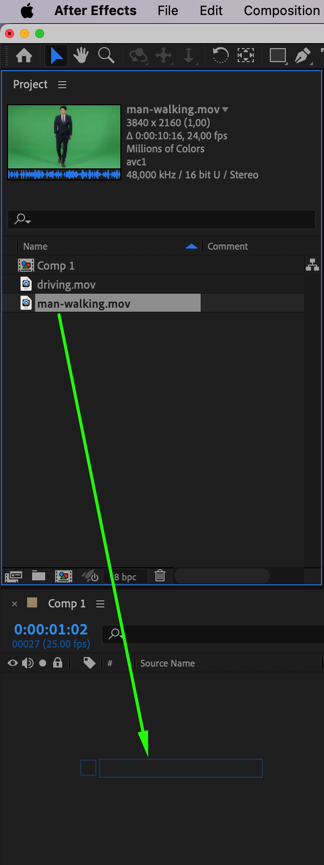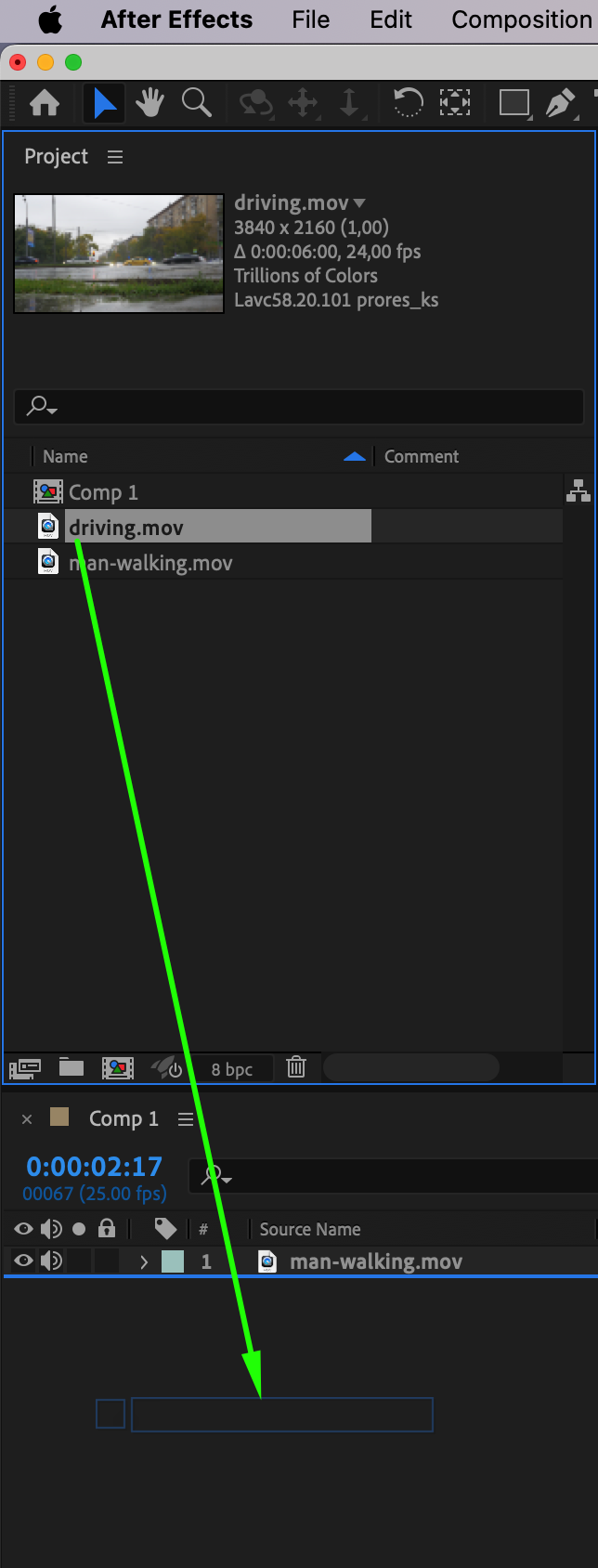 Once you have the footage, import it into After Effects. Go to File > Import > File and select both the video of the car and the person. Ensure you organize the footage in the Project panel so it’s easy to access throughout the process.
