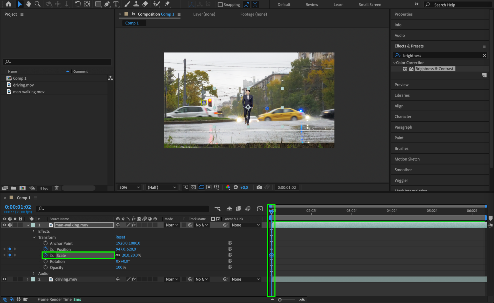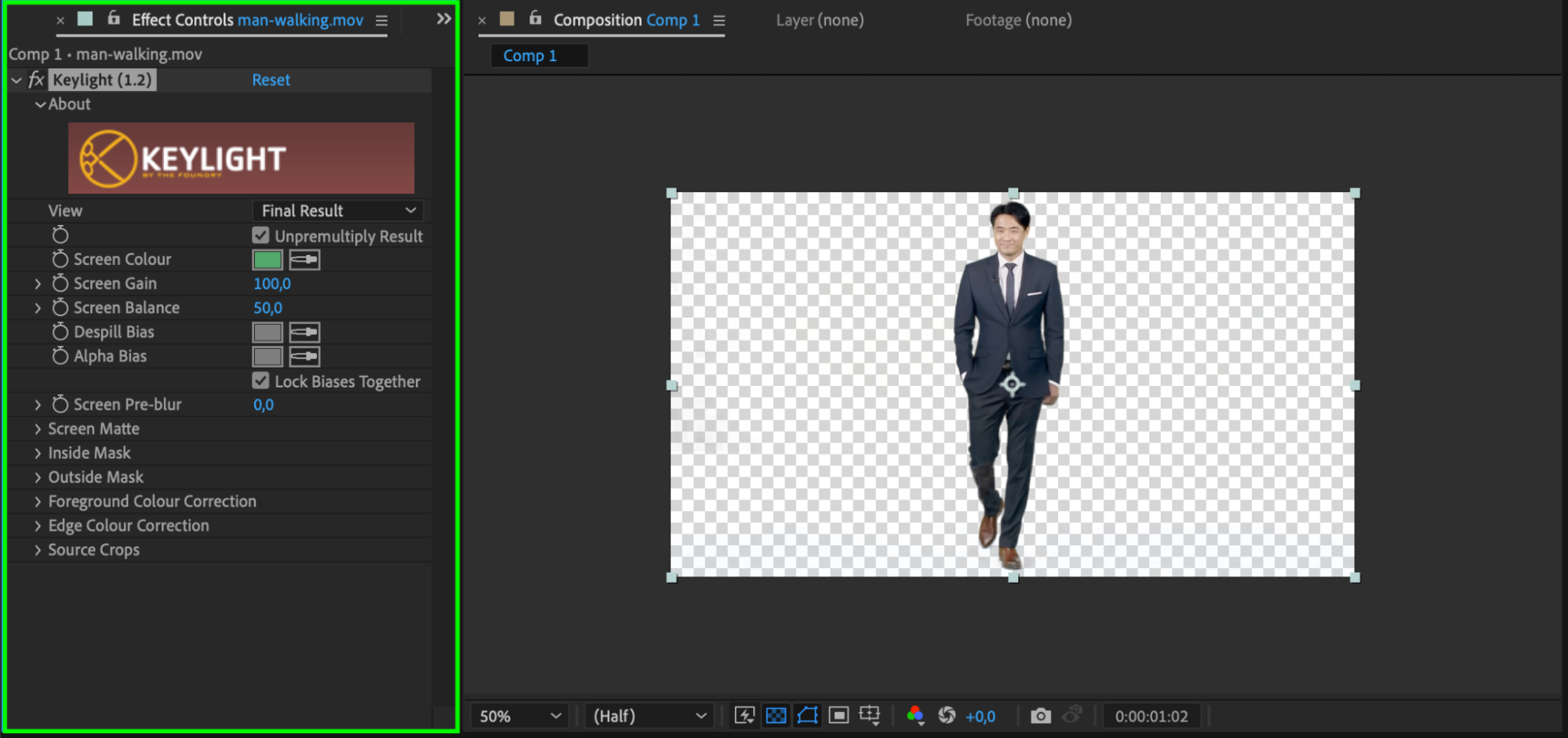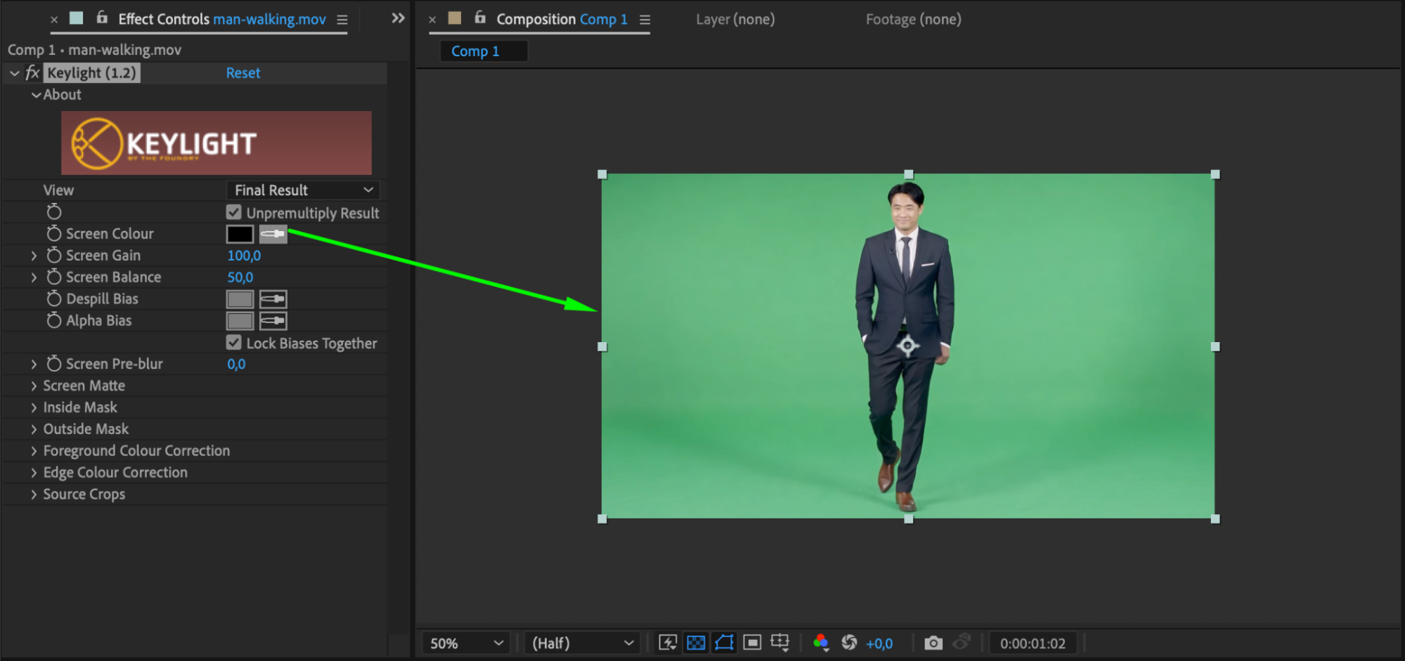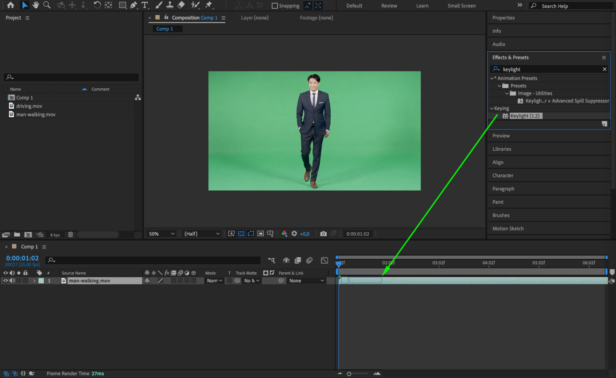 If your footage has a green screen, apply the Keylight effect from the Effects & Presets panel. Drag the Keylight effect onto the layer with the walking person, then use the Eyedropper Tool to select the green background. This will remove the green screen, making the person ready to be composited into the car scene.
