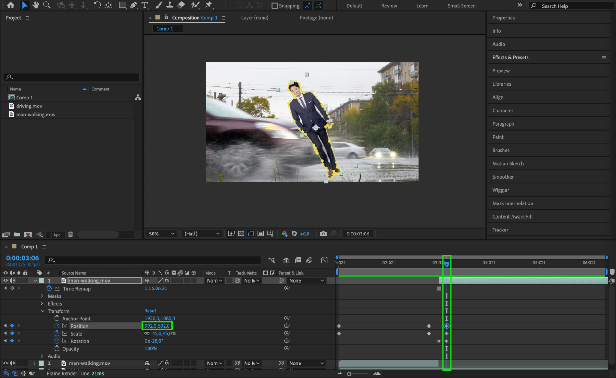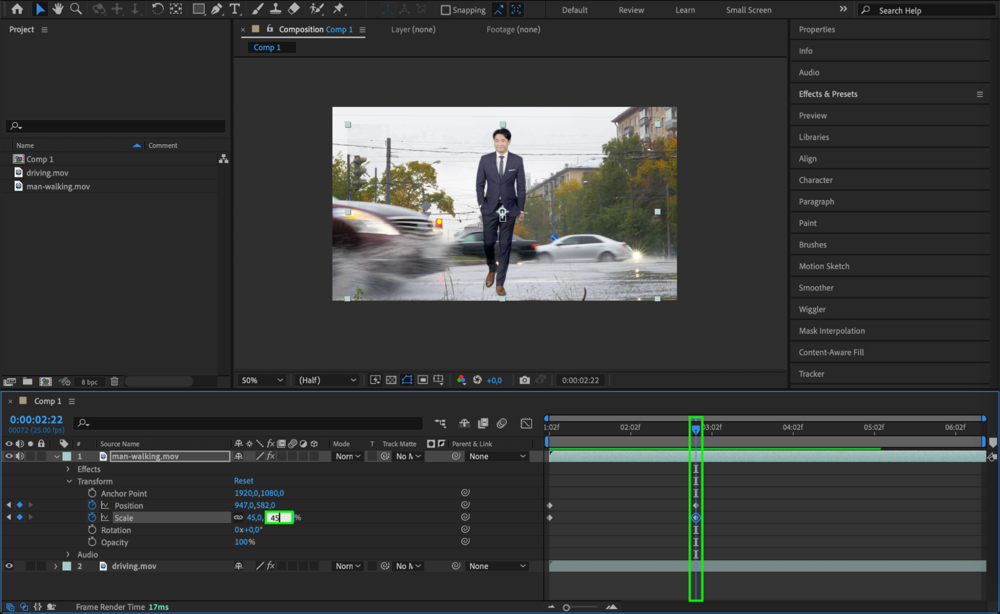 Use keyframes to animate the person’s position as the car approaches. You can adjust the Position and Scale of the person to ensure they are correctly placed in relation to the car.
