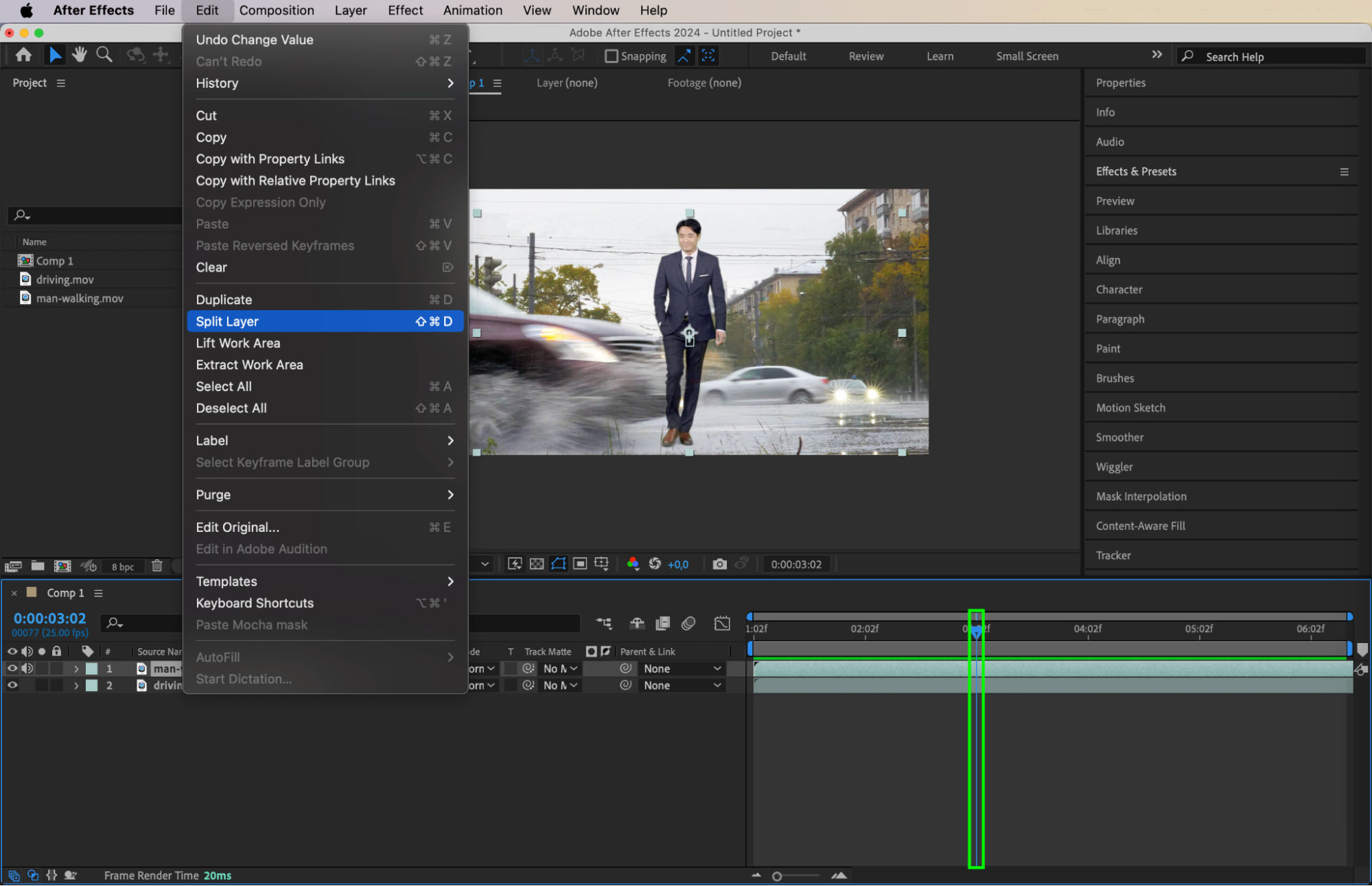 When the car is close to hitting the person, split the person’s layer at the impact moment. Select the layer, move the Current Time Indicator to the frame where the car hits, and press “Ctrl + Shift + D” to split the layer. This ensures the following frames will only show the post-impact action.