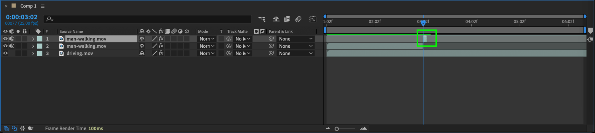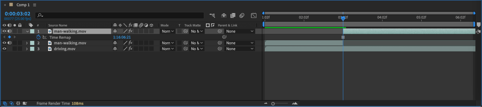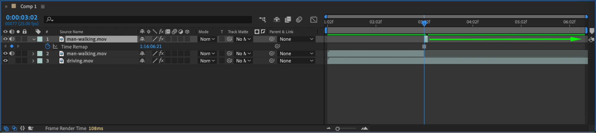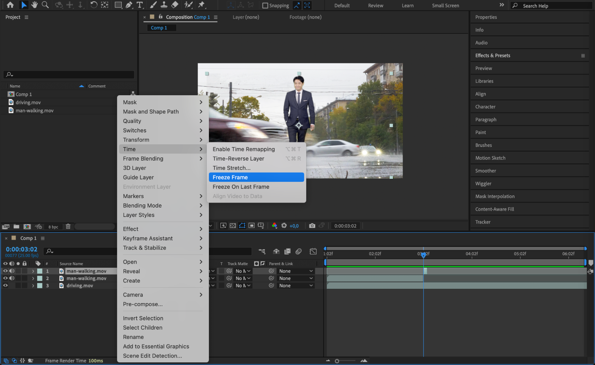 On the second part of the split layer, right-click and choose Time > Freeze Frame. This will freeze the person in place at the moment of impact. Extend this frozen layer to cover the remaining timeline. This adds a sense of abruptness to the scene.