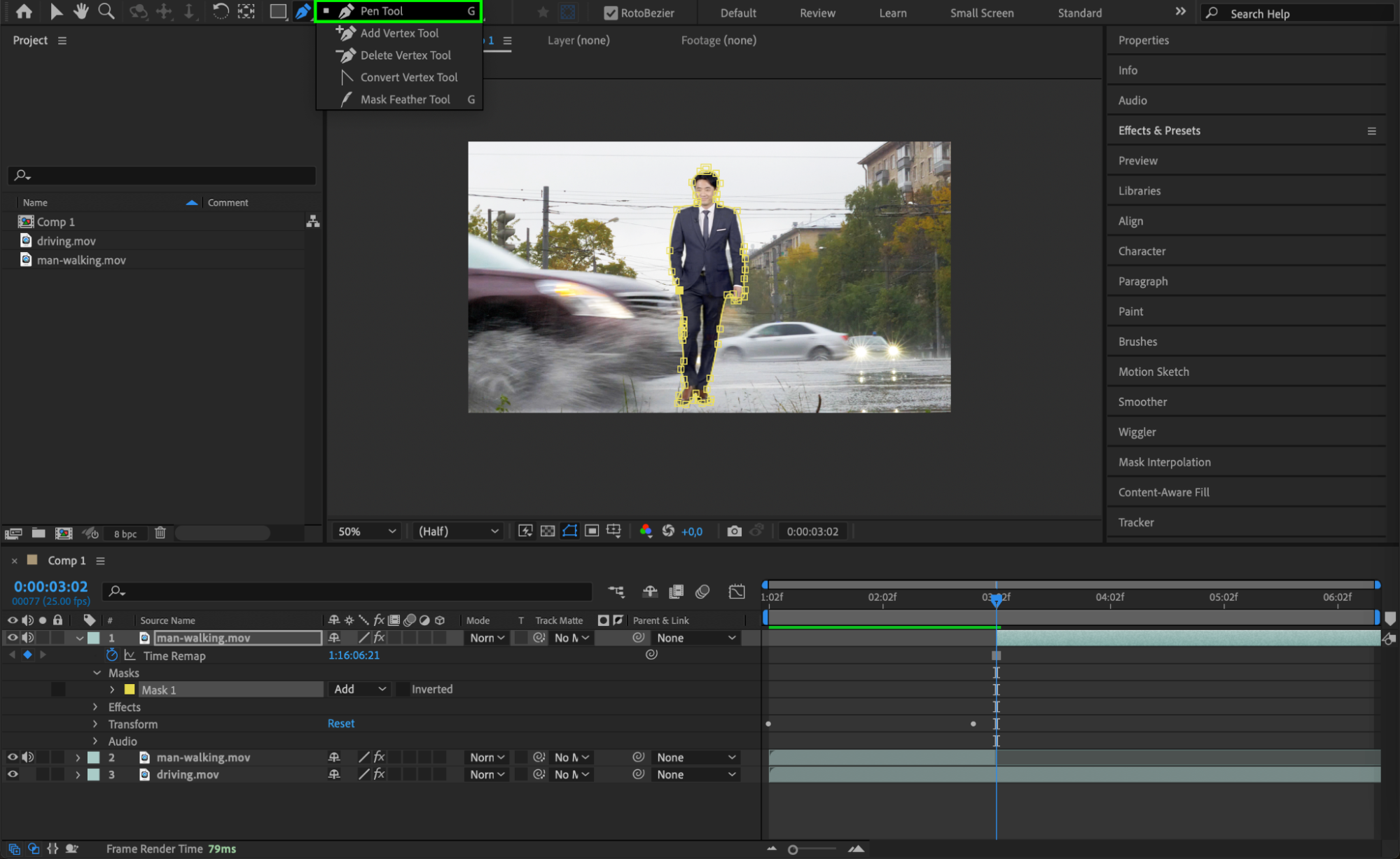 Select the Pen Tool (G) and draw a mask around the person to isolate them. This step allows you to manipulate the shape and size of the mask for precise masking during the hit, making the effect more convincing.