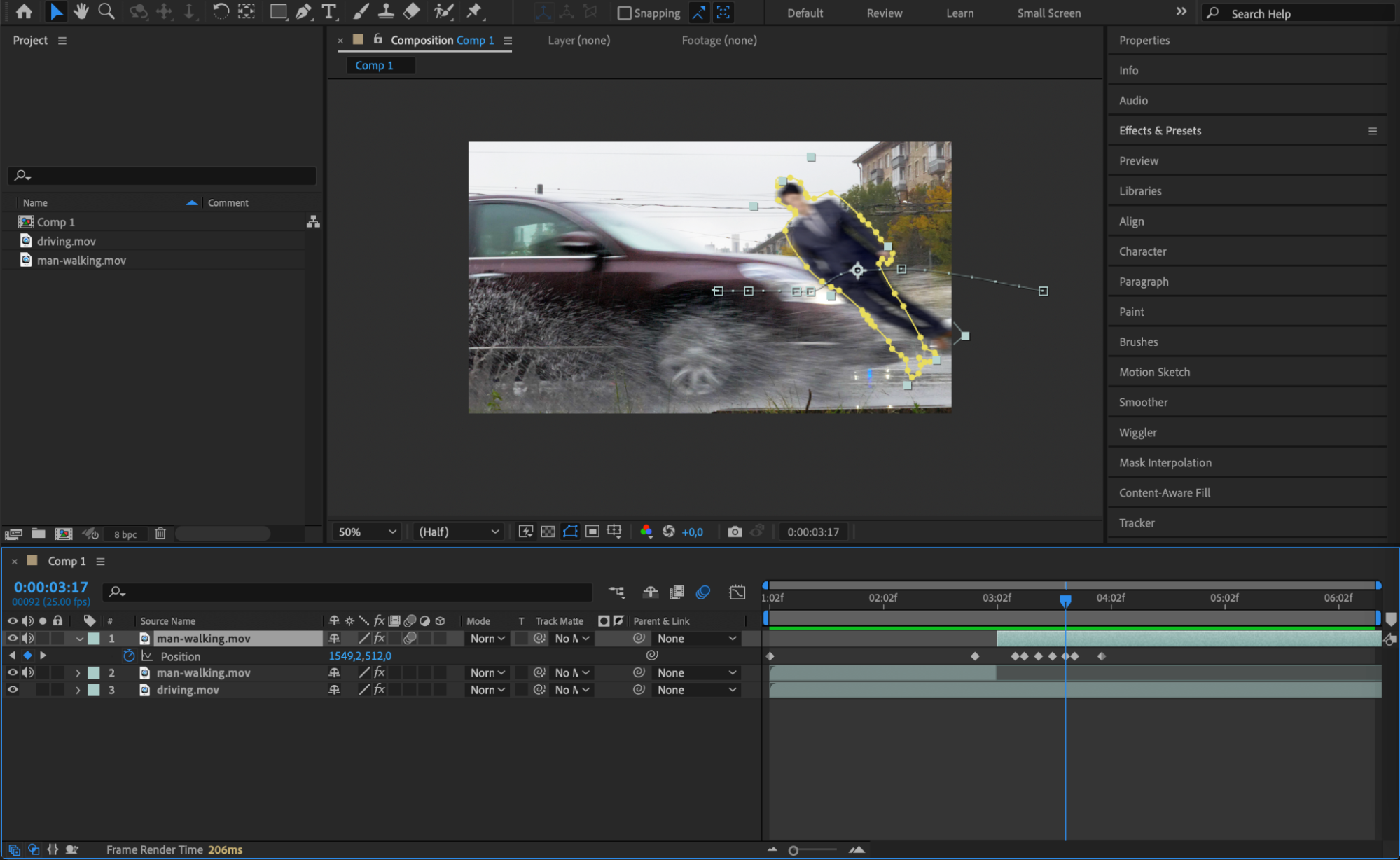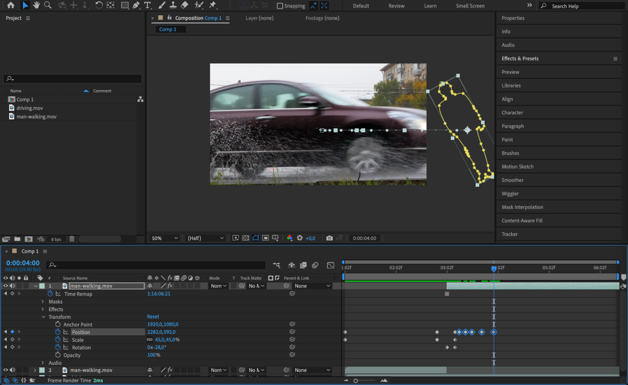 Now, animate the mask and the person’s movement to simulate them being hit by the car. Use keyframes on the Position and Rotation properties to create the effect of the person flying backward. The key is to make the movement sharp and fast, mimicking the force of the hit.
