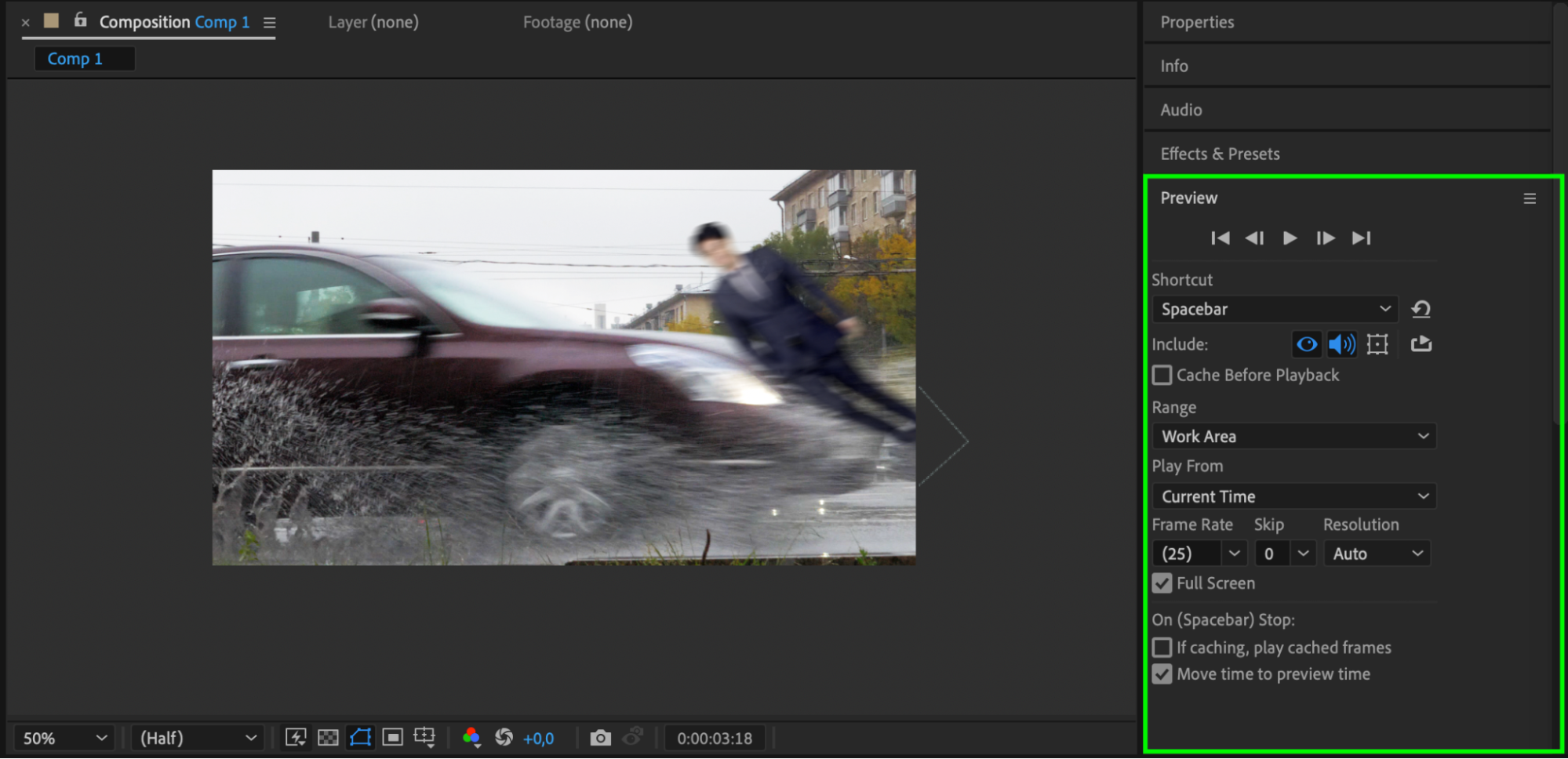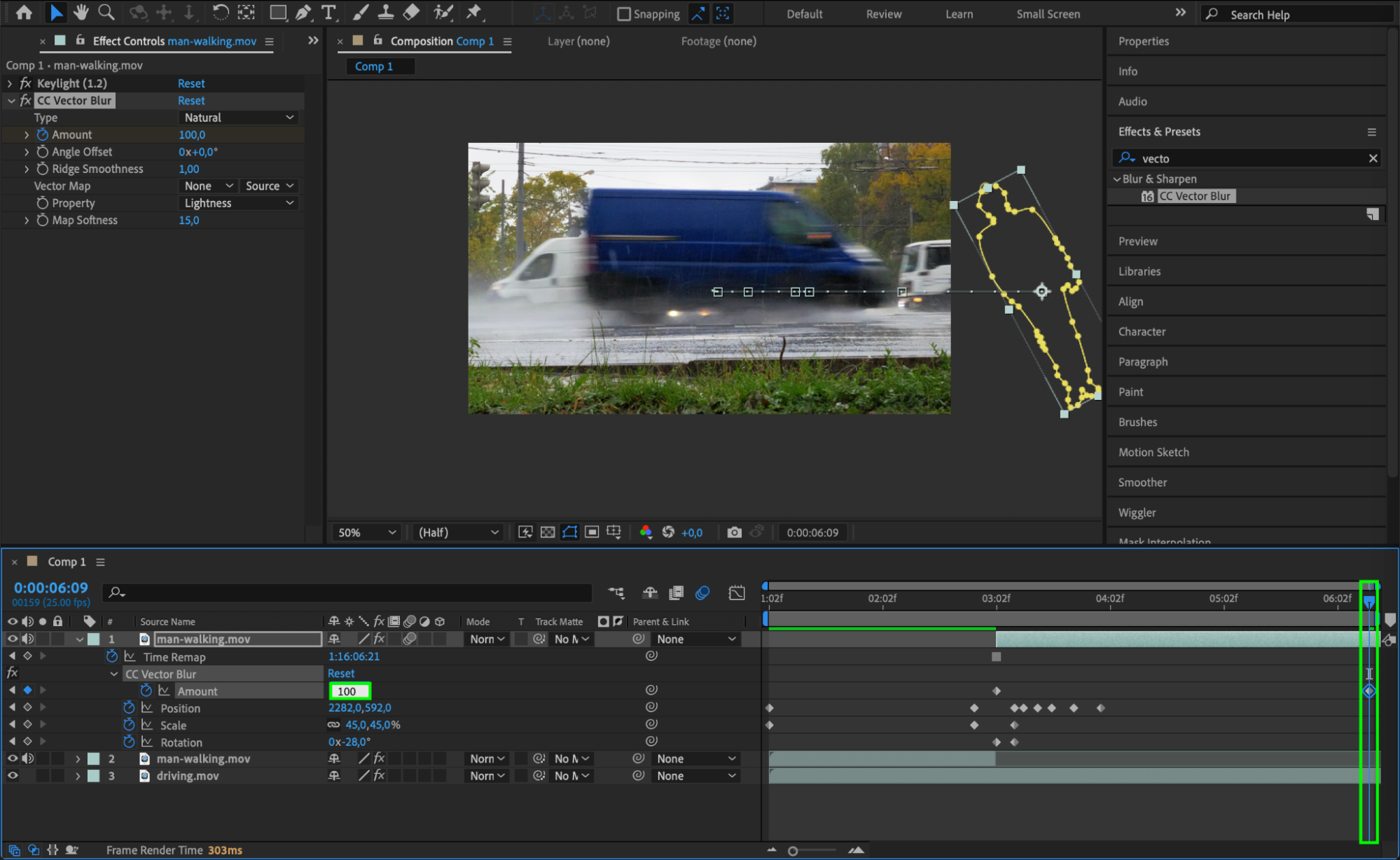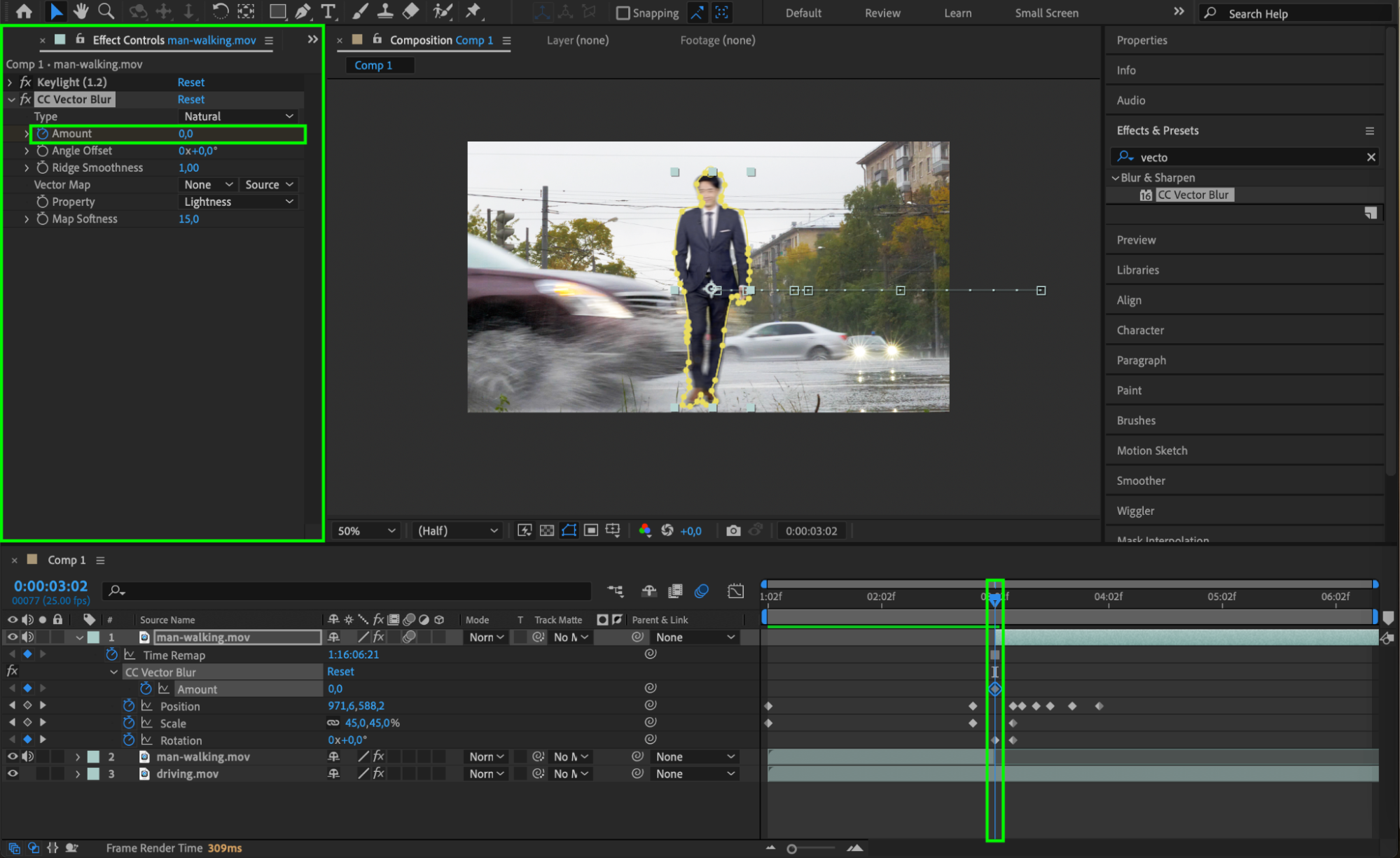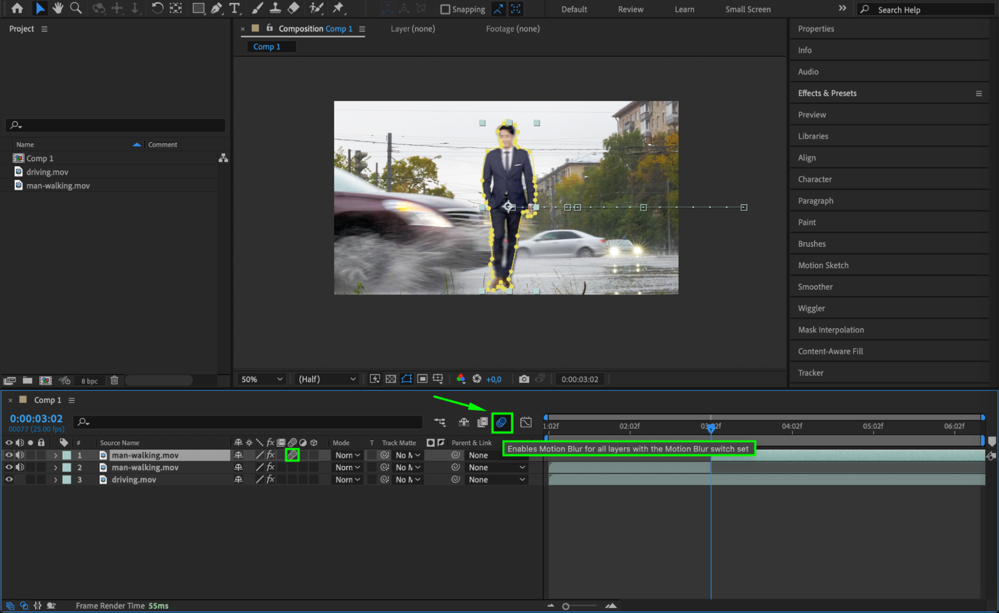 Enable Motion Blur for the person’s layer to add realism to the fast movement. You can also apply CC Vector Blur from the Effects & Presets panel to add more dynamic blurring, especially for the limbs or body parts that would naturally blur with fast movement.