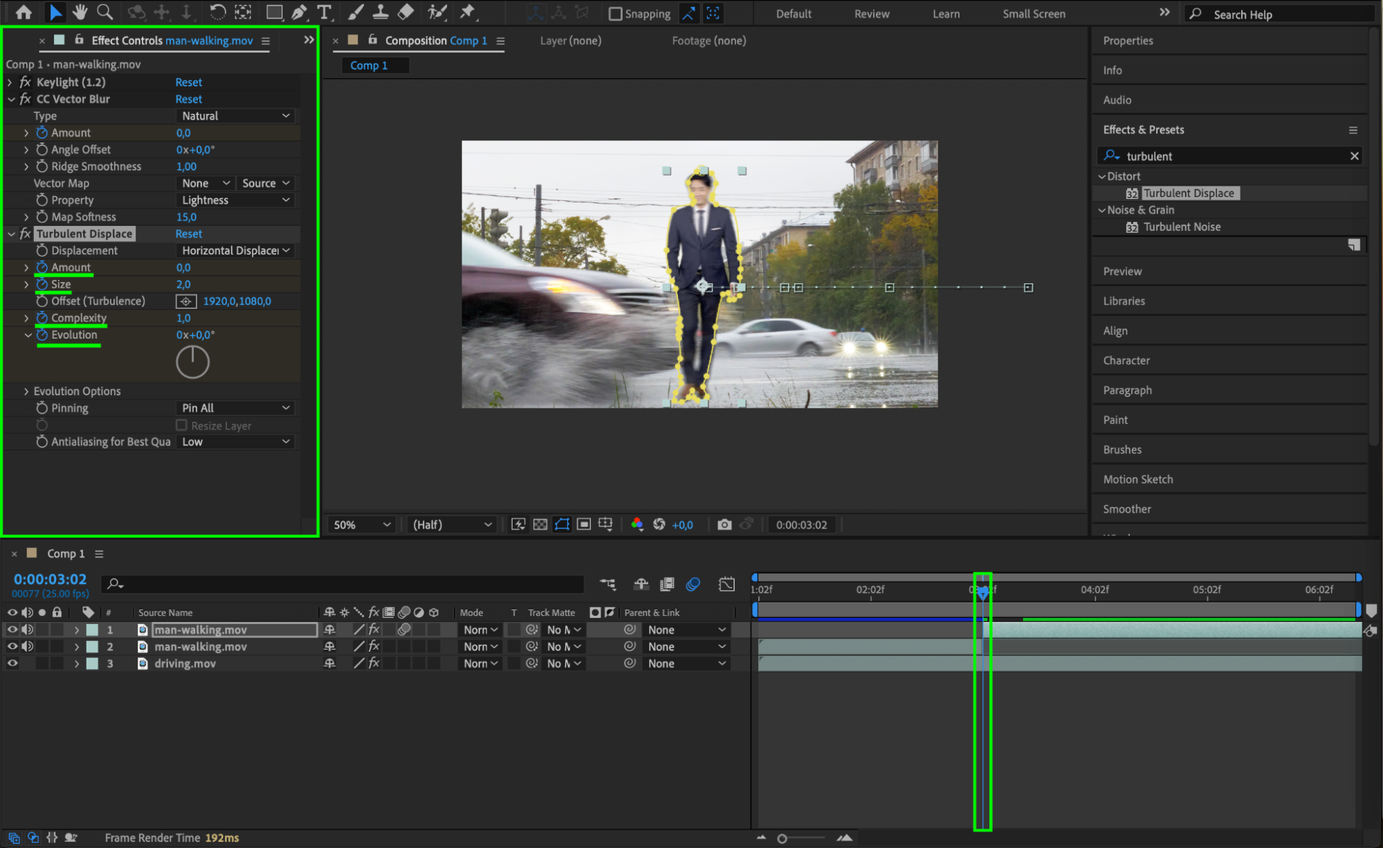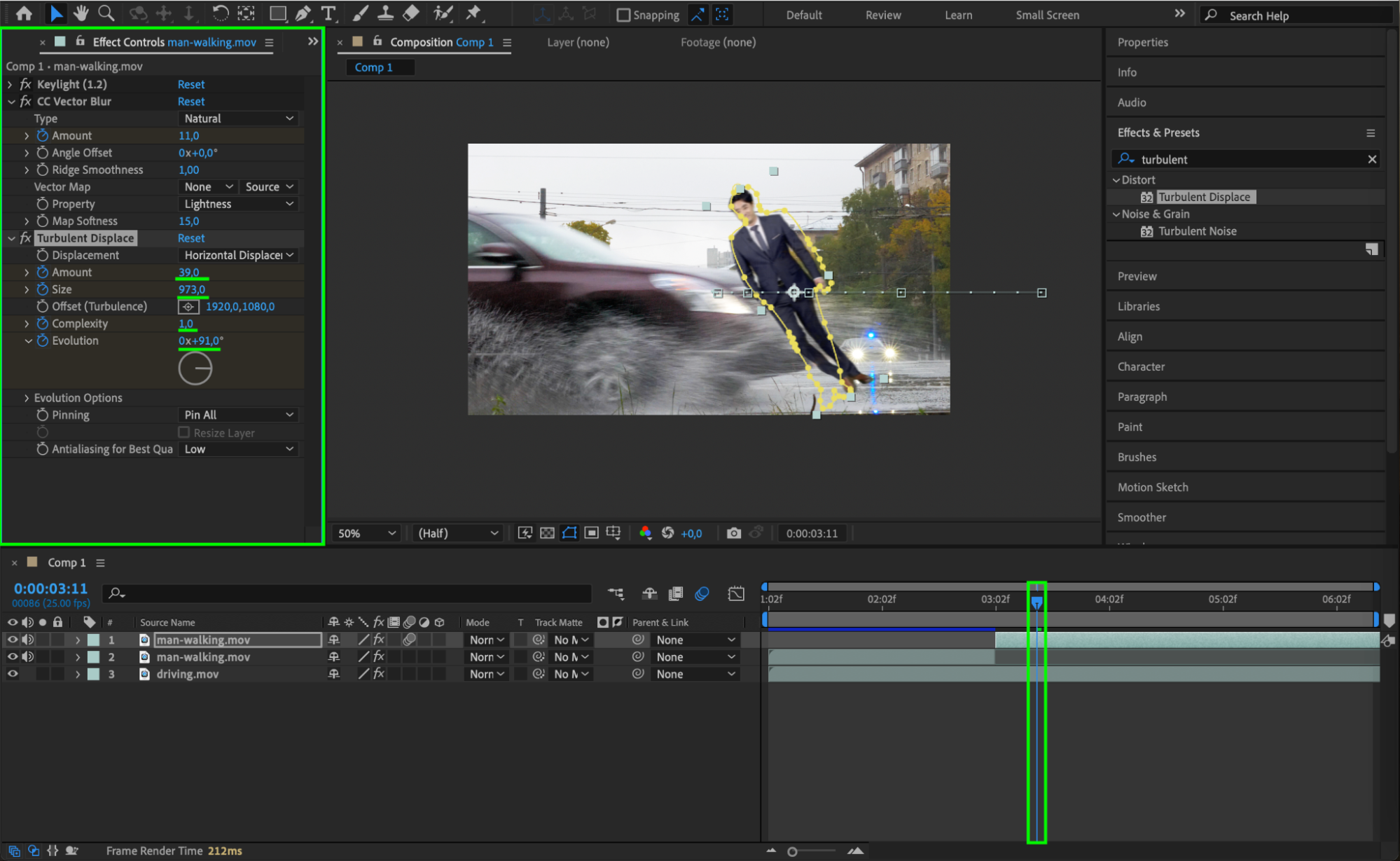 Apply the Turbulent Displace effect from the Effects & Presets panel to the person’s layer. This effect can create subtle distortions on the person’s figure, giving the illusion of motion and impact rippling through the body. Adjust the Amount and Size for a realistic effect.