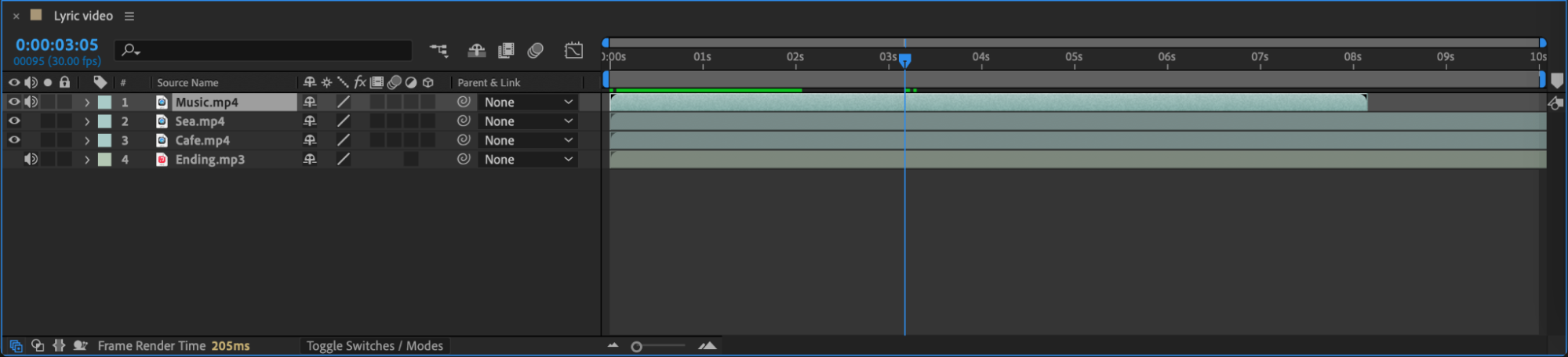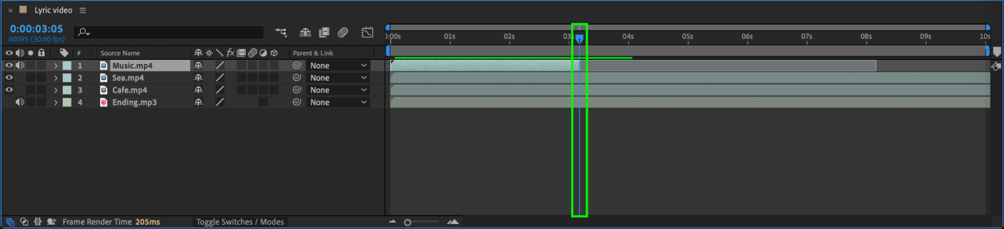 Use the waveform of your audio layer to synchronize text layers with the lyrics or rhythm of the music. Trim text layers with “Alt/Option + [” and “Alt/Option + ]” to ensure the lyrics appear and disappear at the right moments.