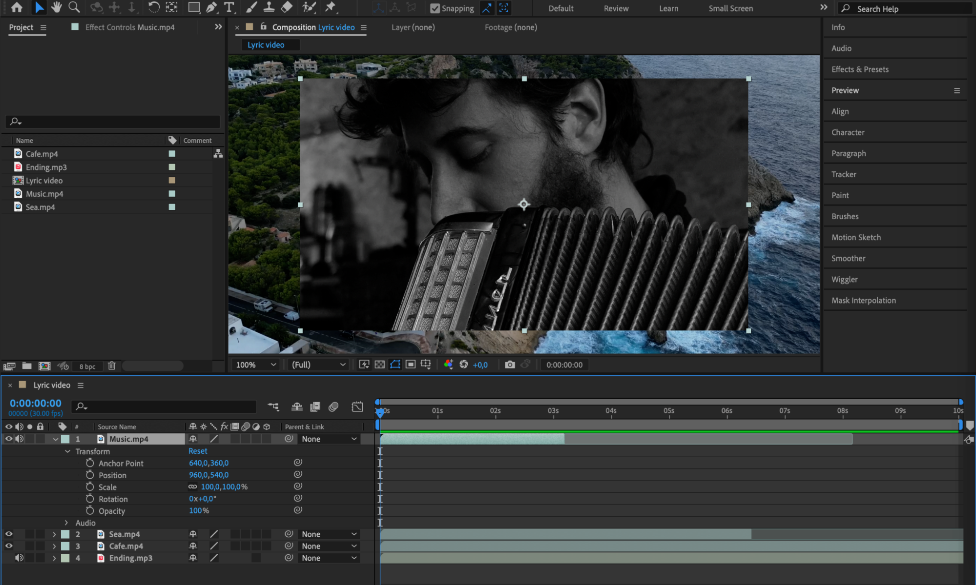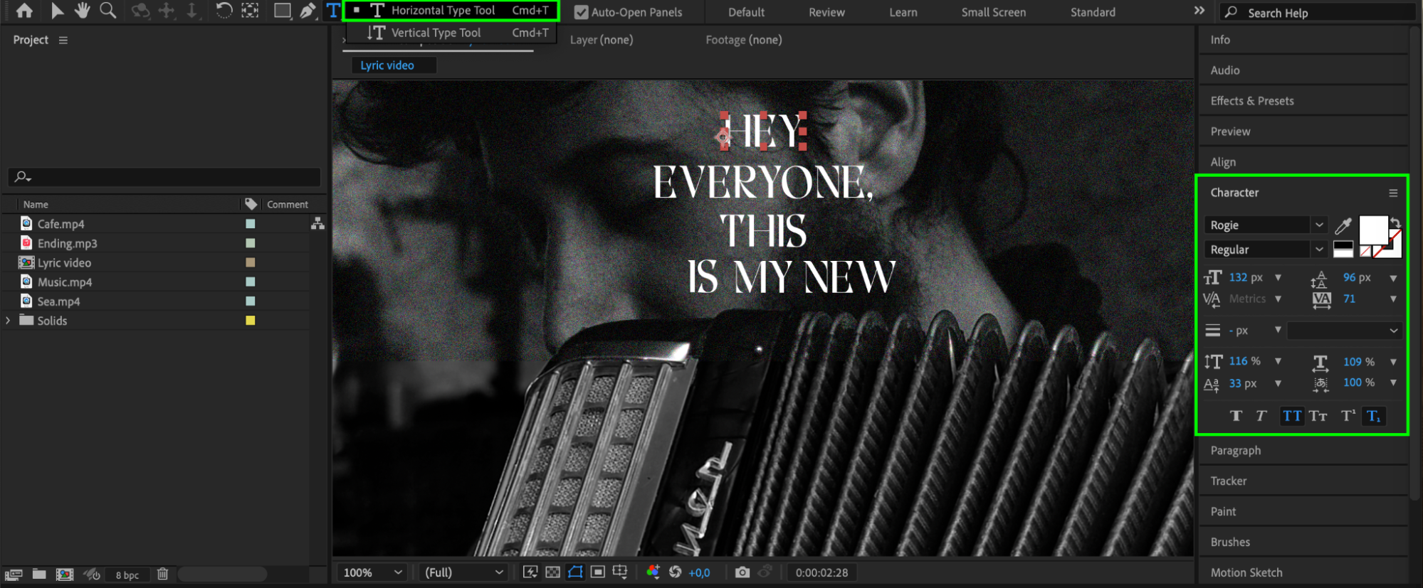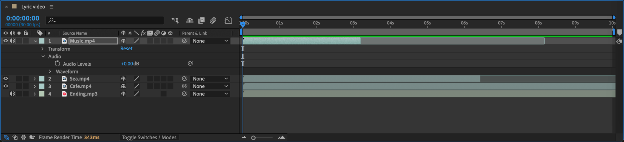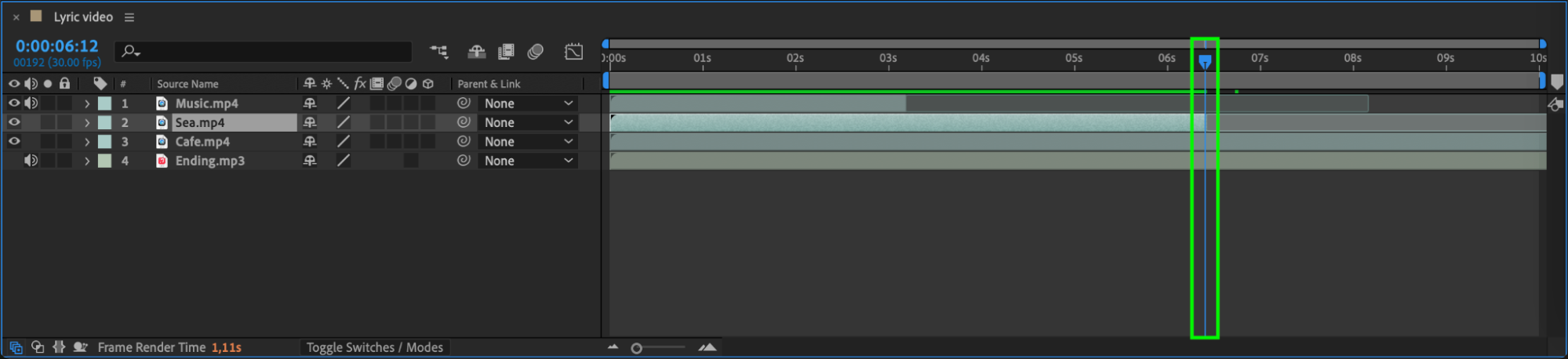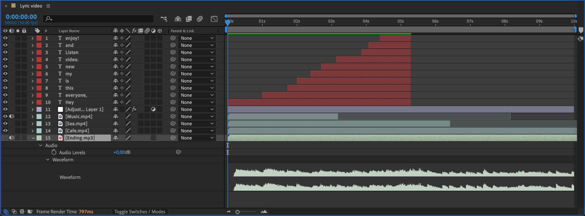 Use the waveform of your audio layer to synchronize text layers with the lyrics or rhythm of the music. Trim text layers with “Alt/Option + [” and “Alt/Option + ]” to ensure the lyrics appear and disappear at the right moments.