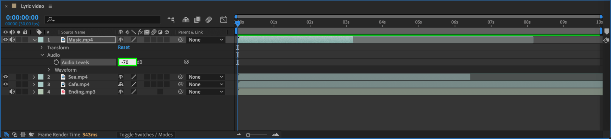 For video layers with unwanted audio, set the Audio Level parameter to -70 to mute the sound. If you want to include background noise or sound effects at specific points, use keyframes to adjust the audio levels accordingly.