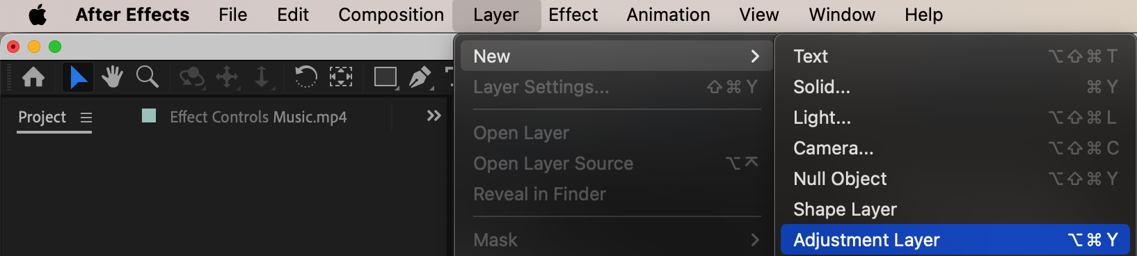Create an adjustment layer by selecting Layer > New > Adjustment Layer. Place this layer above your video layers to apply effects to all underlying layers.