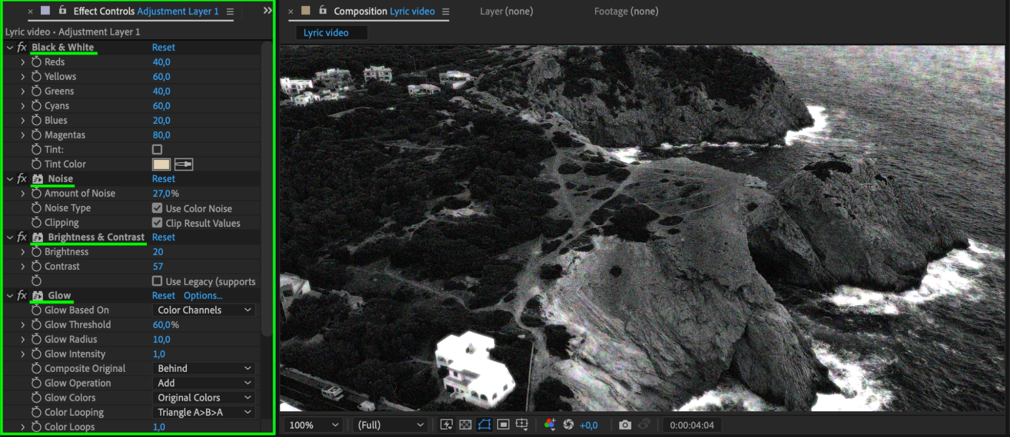 Use the Effects & Presets panel to find suitable effects and drag them onto the adjustment layer. Use the Effect Controls panel to tweak the applied effects as needed.