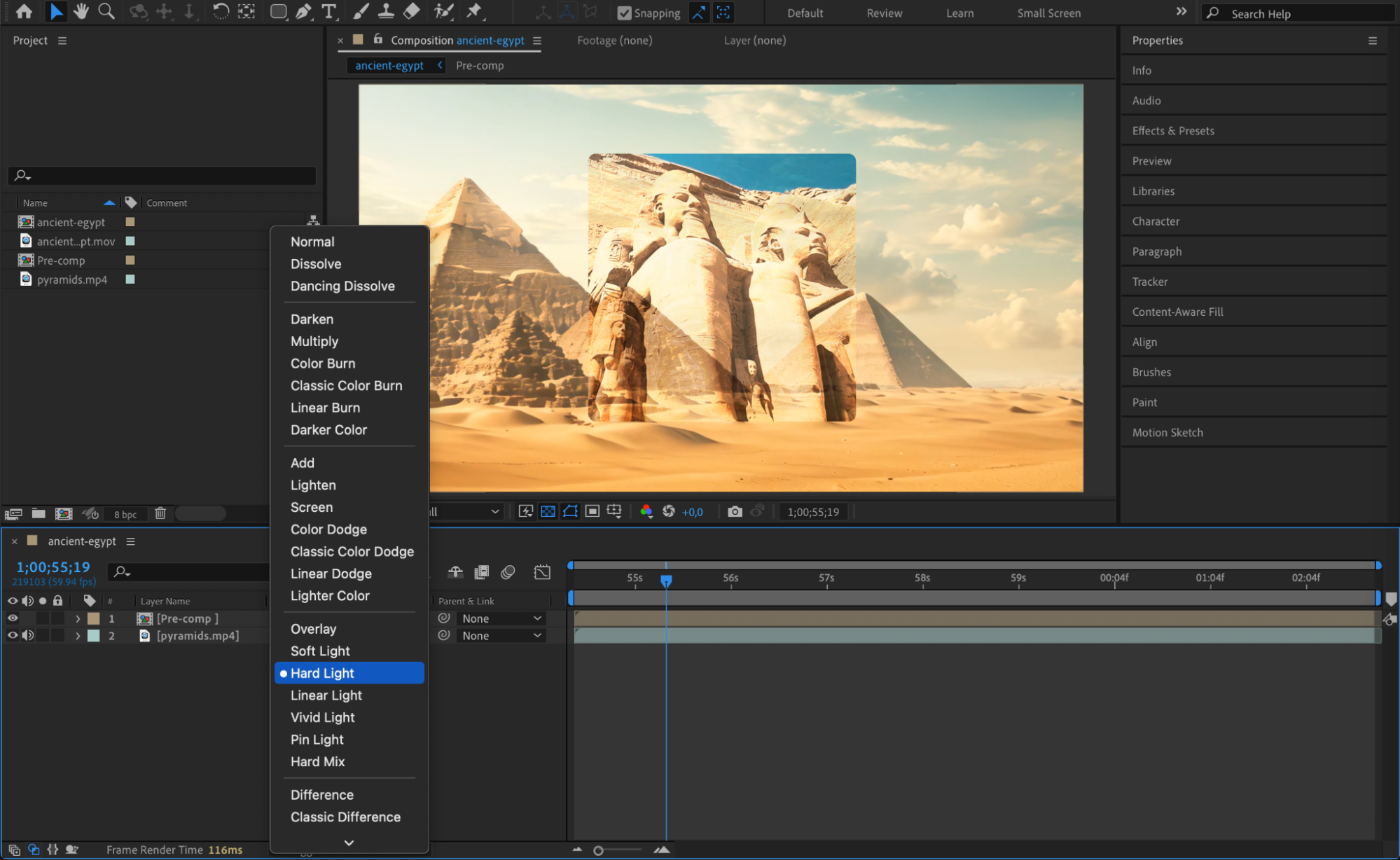 To enhance the effect, select the pre-comp layer and try different Blend Modes like Overlay, Screen, Multiply, or Hard Light from the Modes dropdown. This will help blend the layers more naturally.