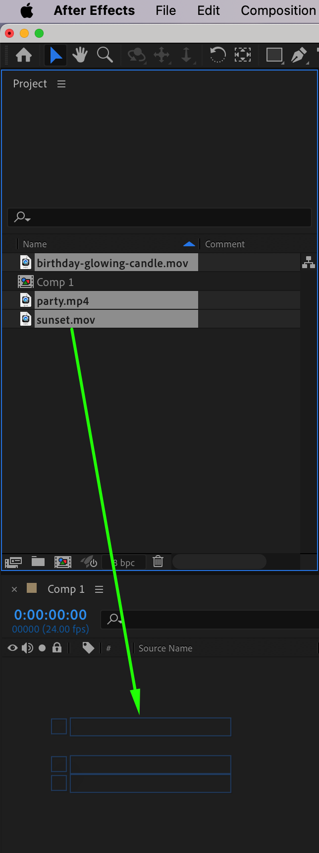 Import your photos and video resources by going to File > Import > File. Once the files appear in the Project panel, drag and drop them onto the Timeline panel. Arrange them according to your storyboard or plan. Use the current time indicator and shortcuts “Alt/Option + [” and “Alt/Option + ]” to trim your layers as needed, ensuring that each clip is precisely timed to fit the video’s narrative.