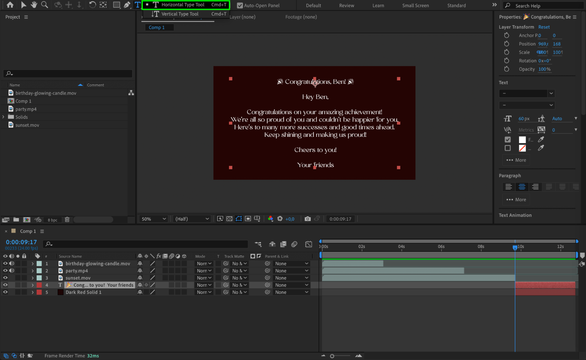 To make your birthday video truly special, start by adding personalized text and graphics. Use the Text Tool (Ctrl/Cmd + T) to insert a heartfelt birthday message or congratulatory note. You can customize the text by choosing fonts, colors, and sizes that fit the celebrant’s style or the theme of the video.