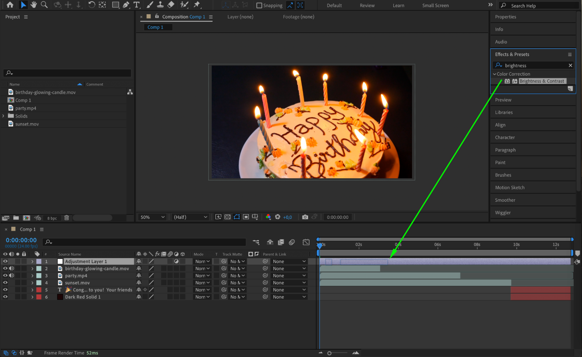 To further personalize your video, use effects and adjustment layers to give it a cohesive and unique style. Start by adding adjustment layers to apply effects uniformly across all your video layers. Additionally, use effects like color correction or stylization to match the video’s visuals with the celebrant’s preferences or the overall theme. This approach ensures that every element in your video is harmonized and enhances the personalized touch of your birthday video.