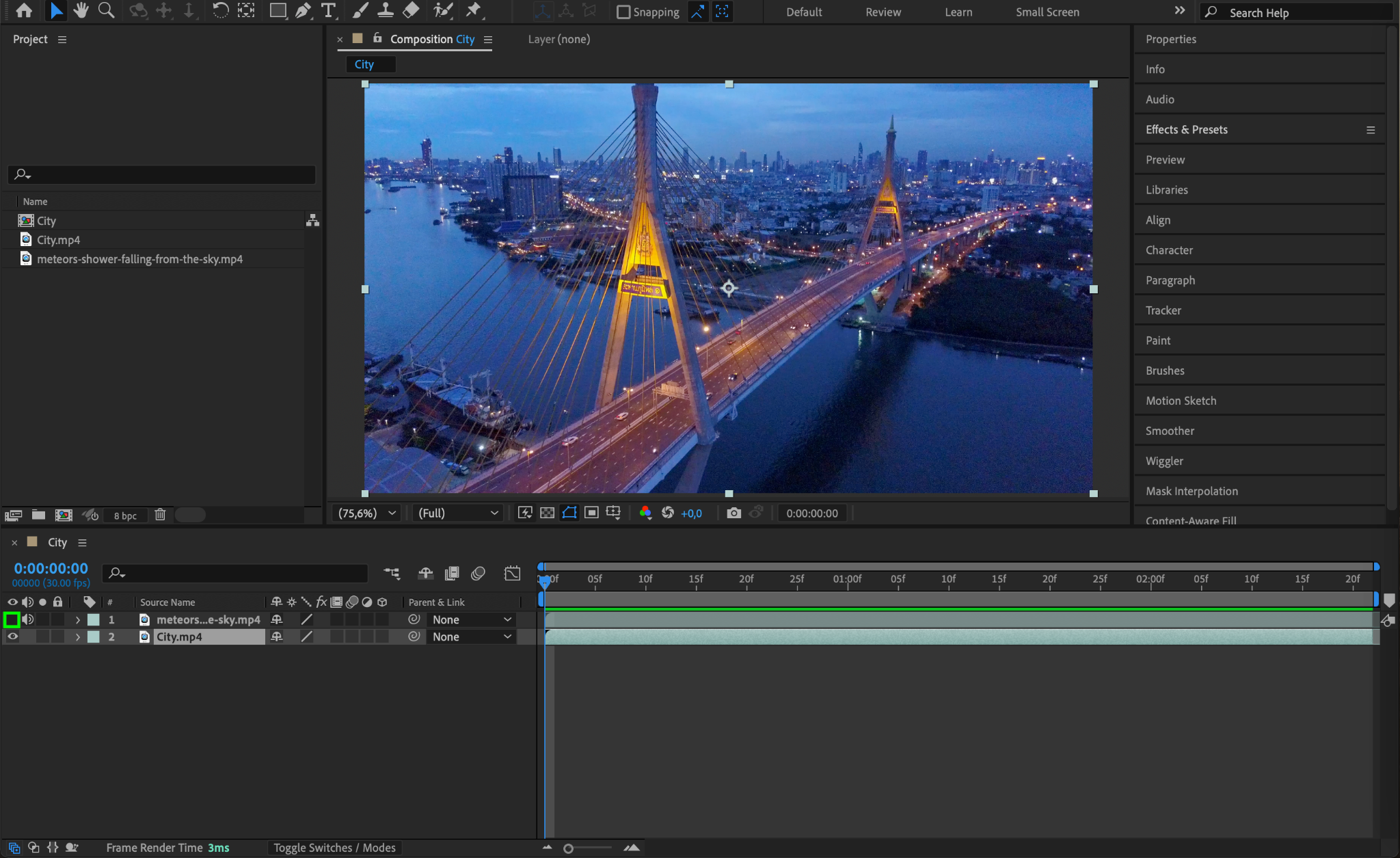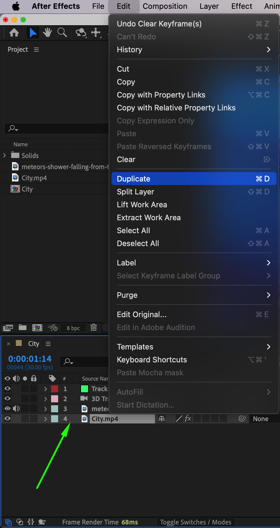 For now, hide the meteor layer to focus on preparing your main footage. To make the layer invisible, click on the Eye Icon next to the layer in the timeline.