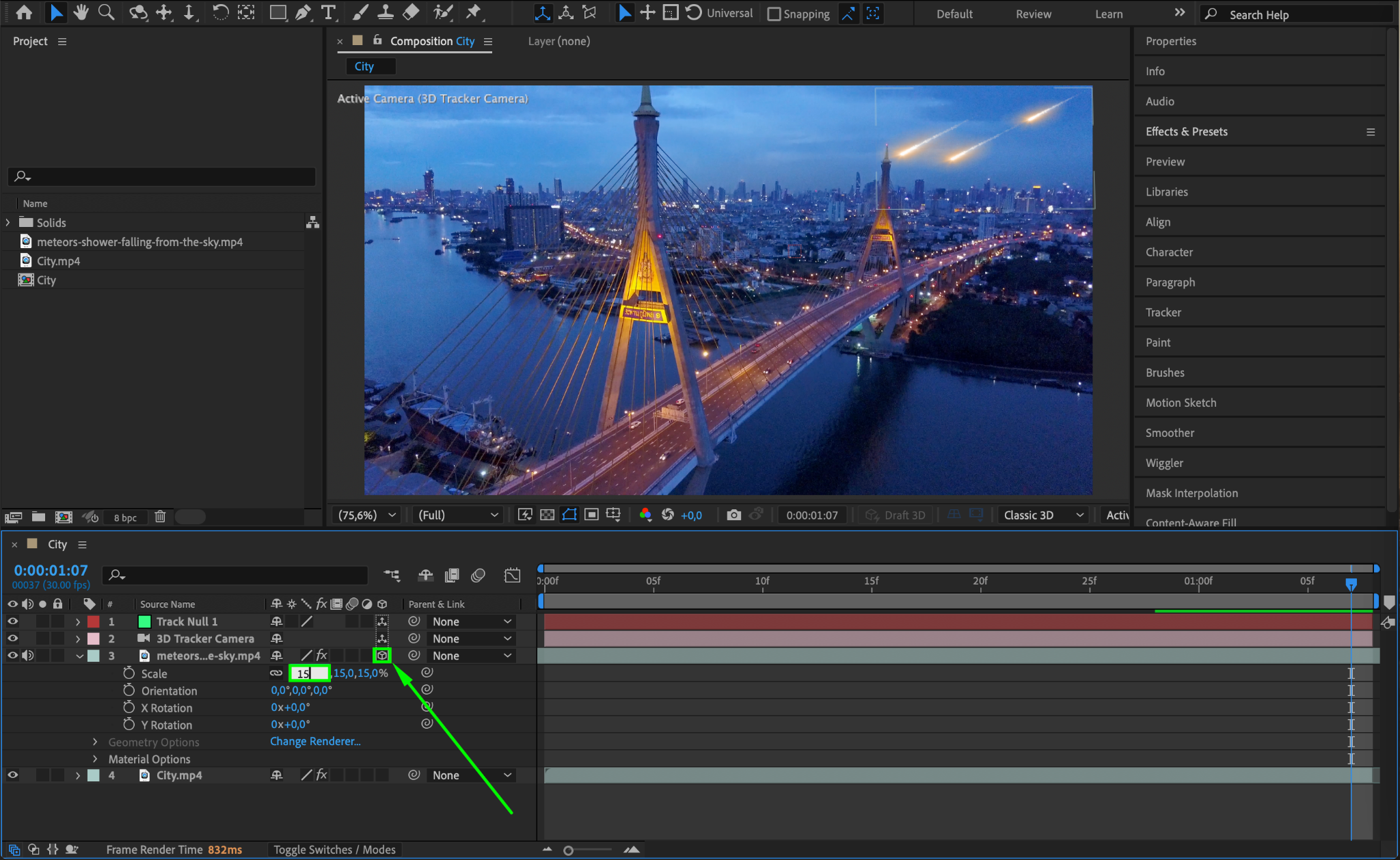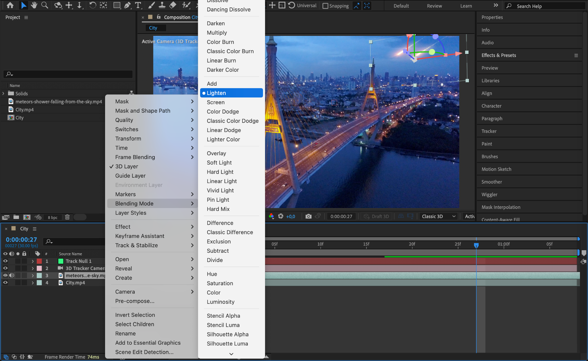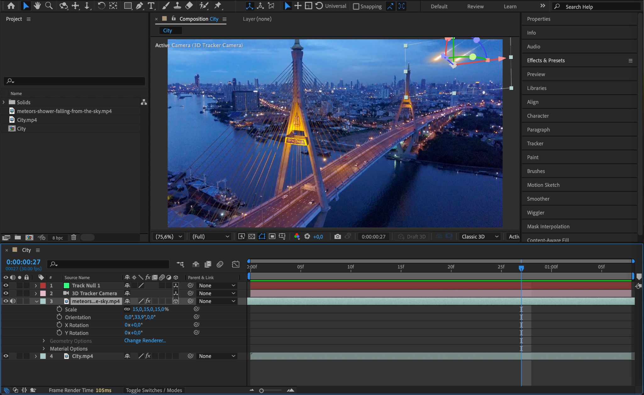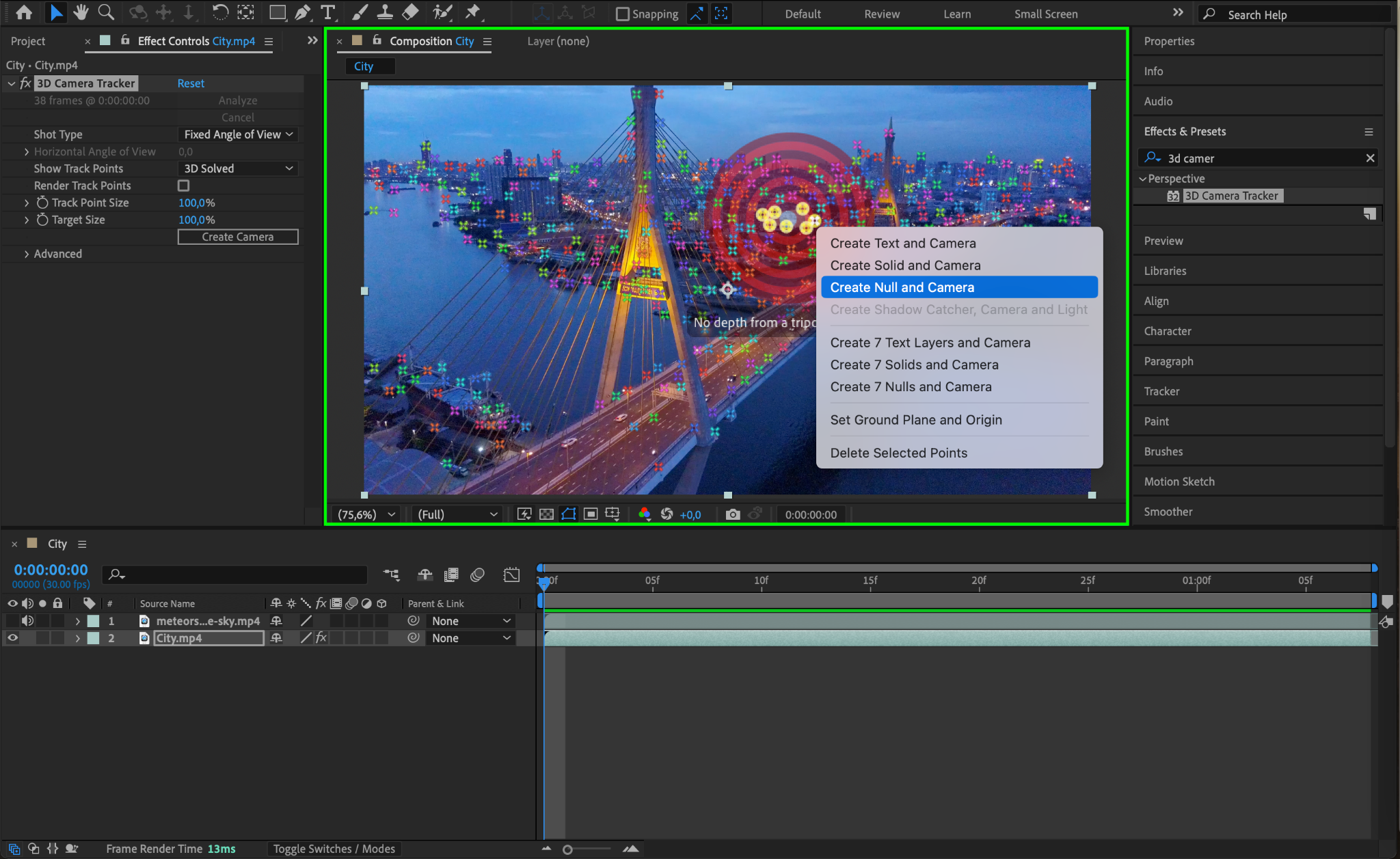 Select your main footage layer and apply the 3D Camera Tracker effect from the Effects & Presets panel. Allow the tracker to analyze your scene, and once complete, select an area in the footage where the meteor should land or move through. Right-click and choose Create Null and Camera.