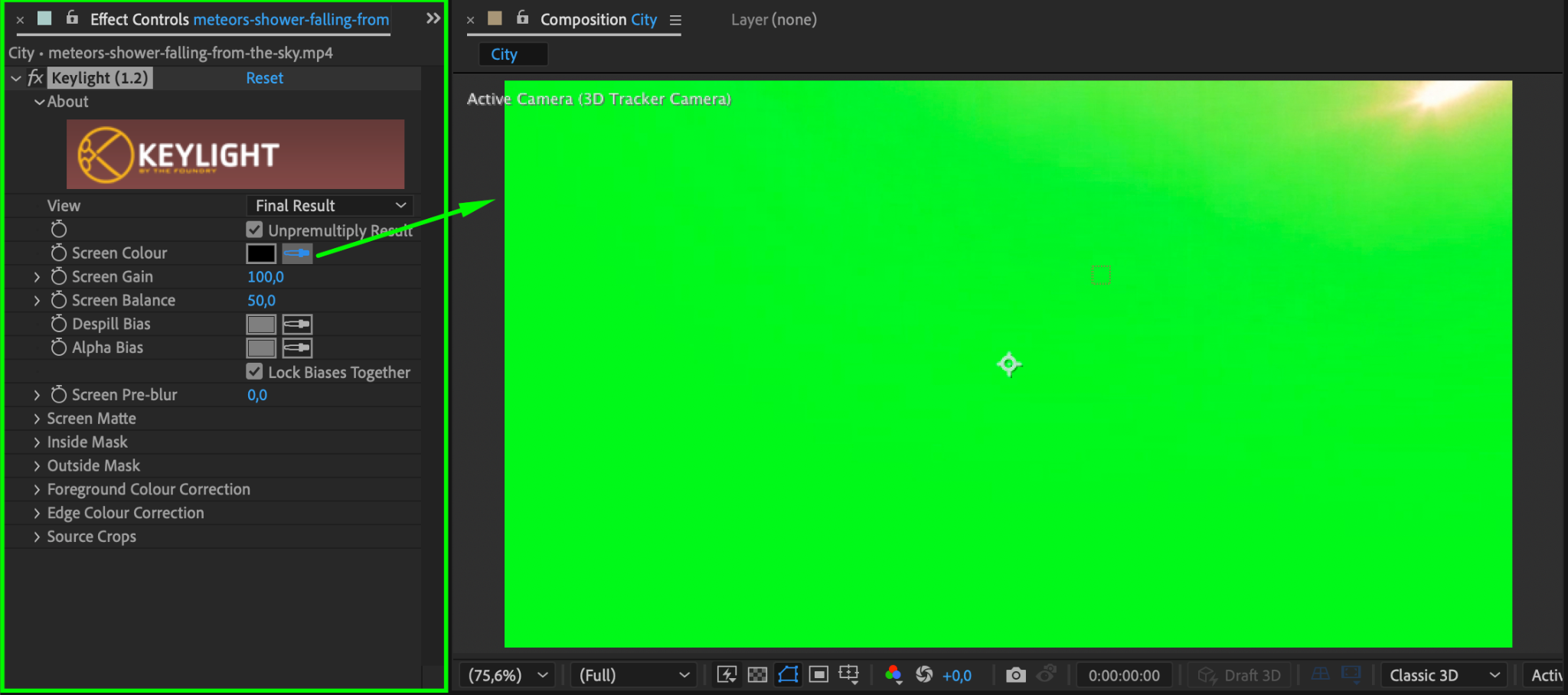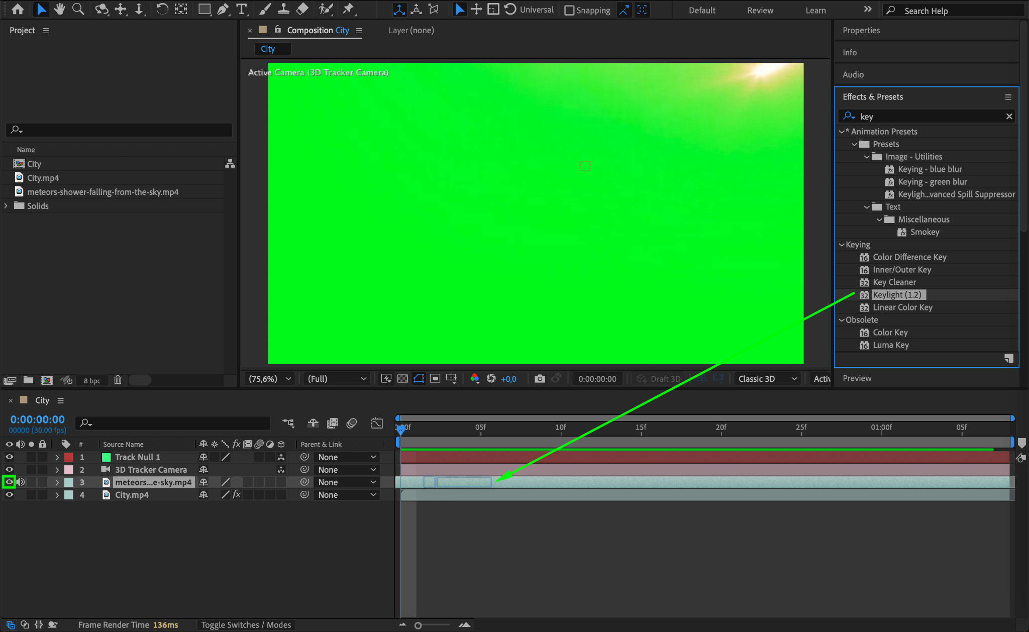 Make the meteor layer visible again by clicking the Eye Icon. Apply the Keylight Effect from the Effects & Presets panel to remove its background. Use the Eyedropper Tool to select the background color you want to key out. Adjust the settings as needed to clean up the edges.