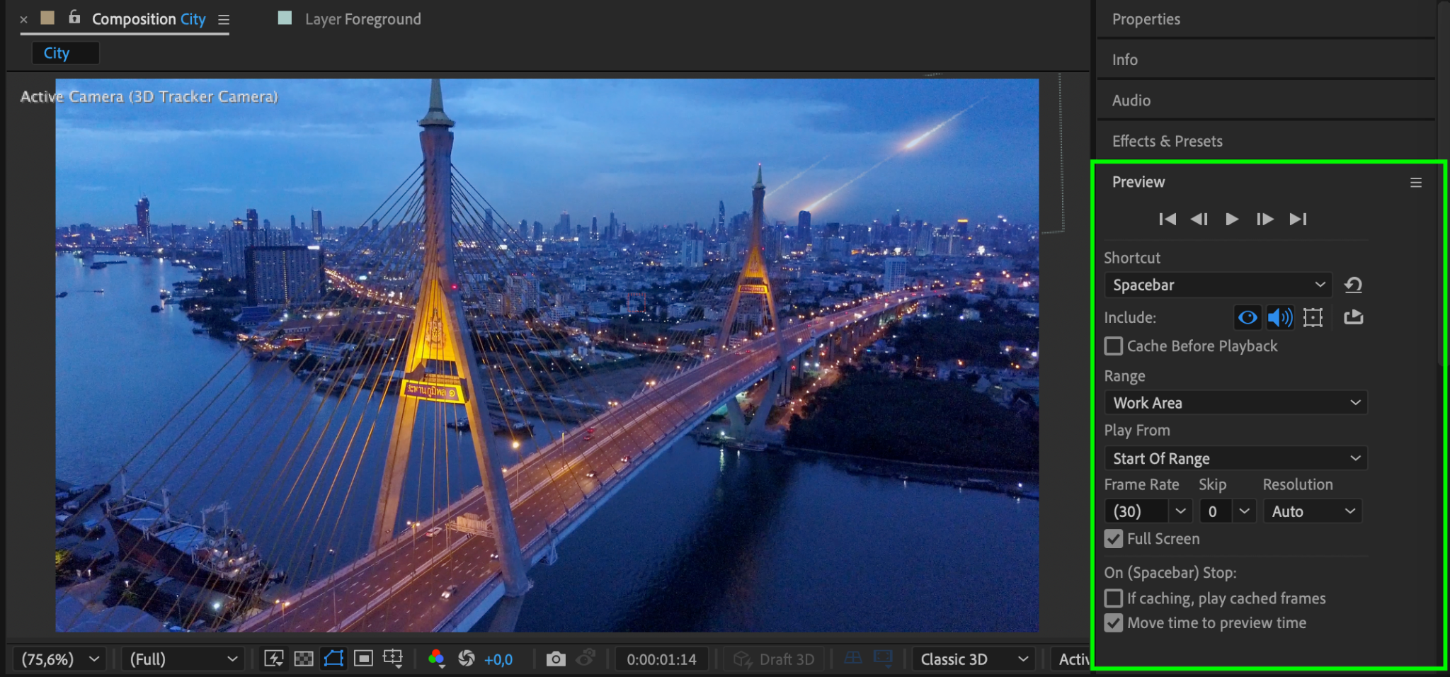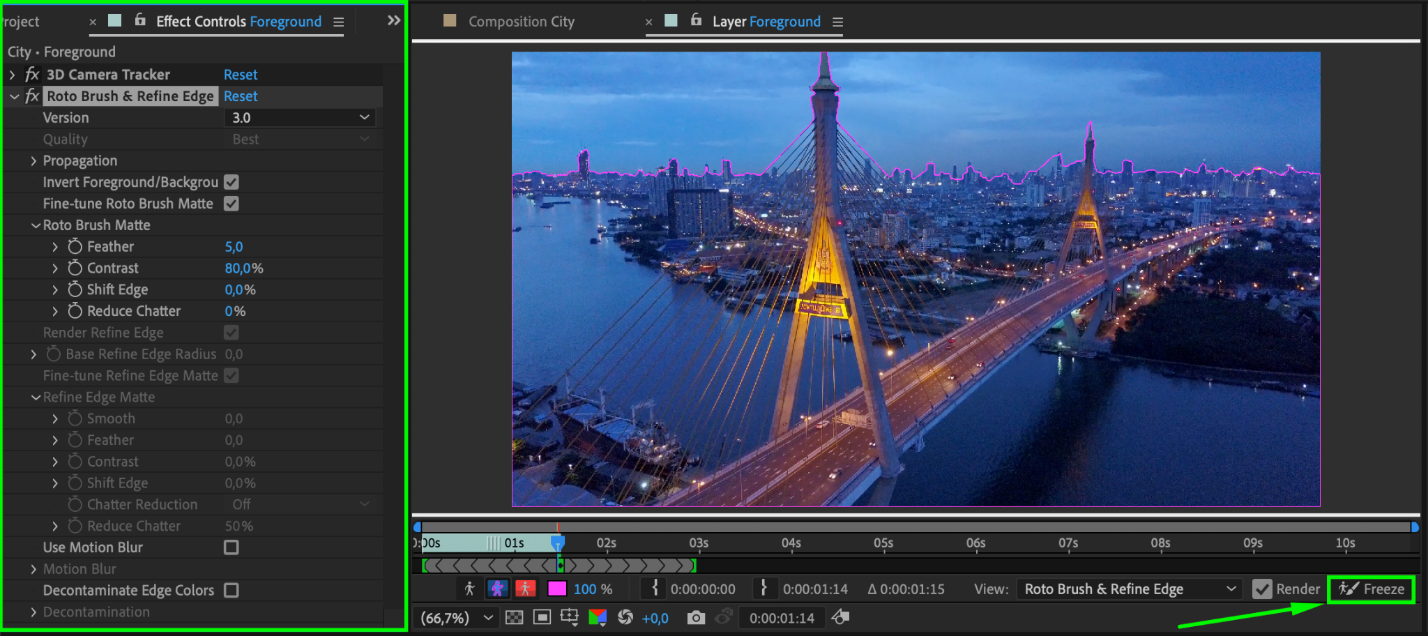 Duplicate your main footage layer and rename the duplicate to “Foreground”. Move it above the meteor layer. Apply the Roto Brush Tool (Alt/Option + W) to this layer to isolate the foreground elements, such as trees or buildings, while excluding the sky. Freeze the selection to lock the mask.