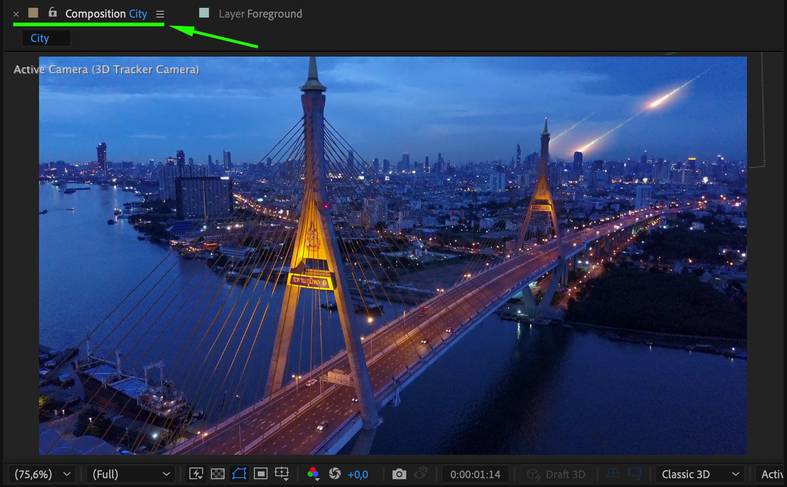 Turn the meteor layer into a 3D layer by selecting the 3D Layer Box in the timeline. Adjust its scale, rotation, and position to align it with the scene.