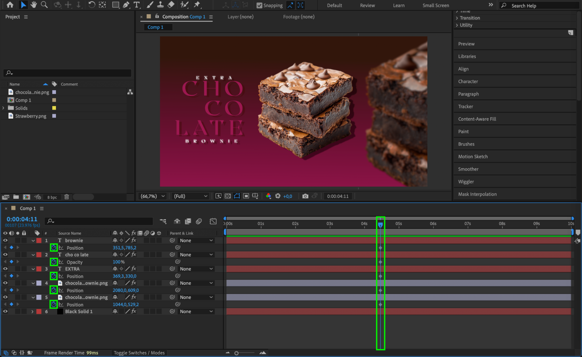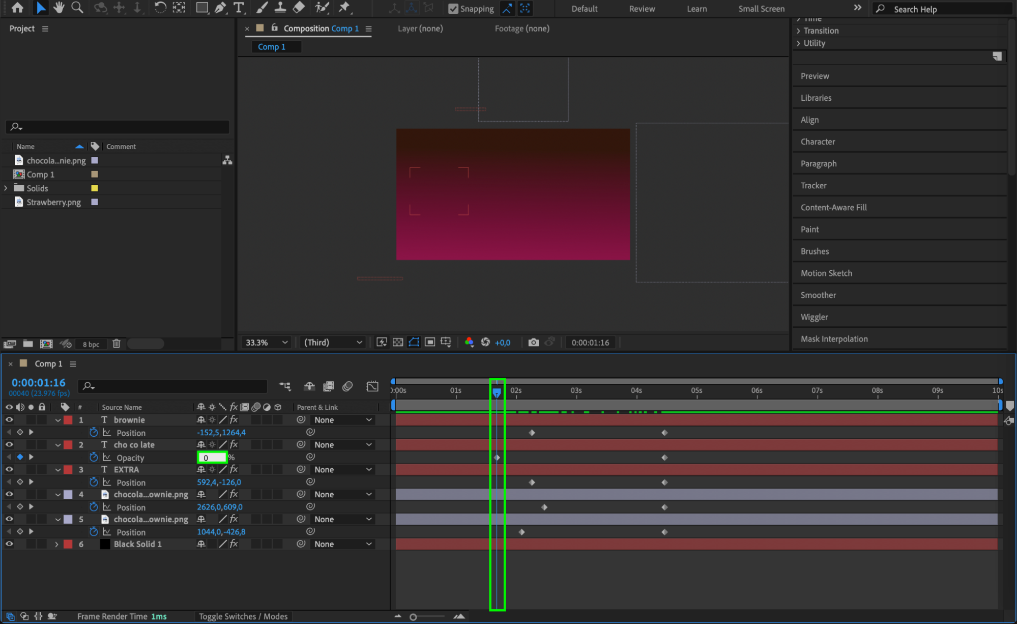 Move the CTI (Current Time Indicator) to the middle of the composition timeline. For each resource, choose a property you want to animate, such as Position, Scale, Rotation, or Opacity, and click the stopwatch icon to create a keyframe. Then, move the CTI forward in time and change the property values to create smooth animation.