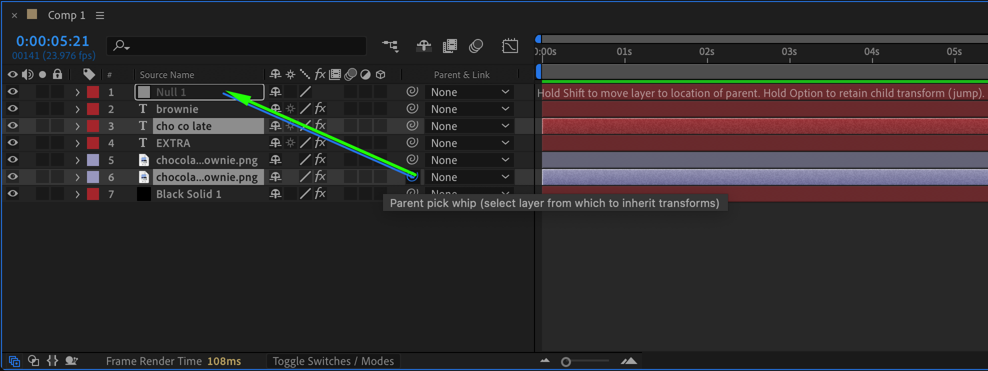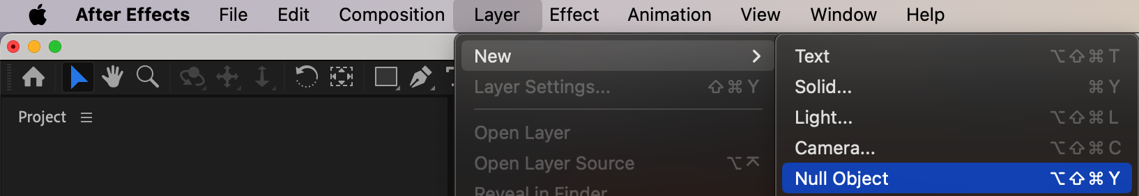 Go to Layer > New > Null Object. A null object allows you to control multiple layers simultaneously. Parent the layers you want to animate to the null object by selecting the layers and dragging the pick whip to the null object. Now, you can animate multiple elements at once by controlling the null object.