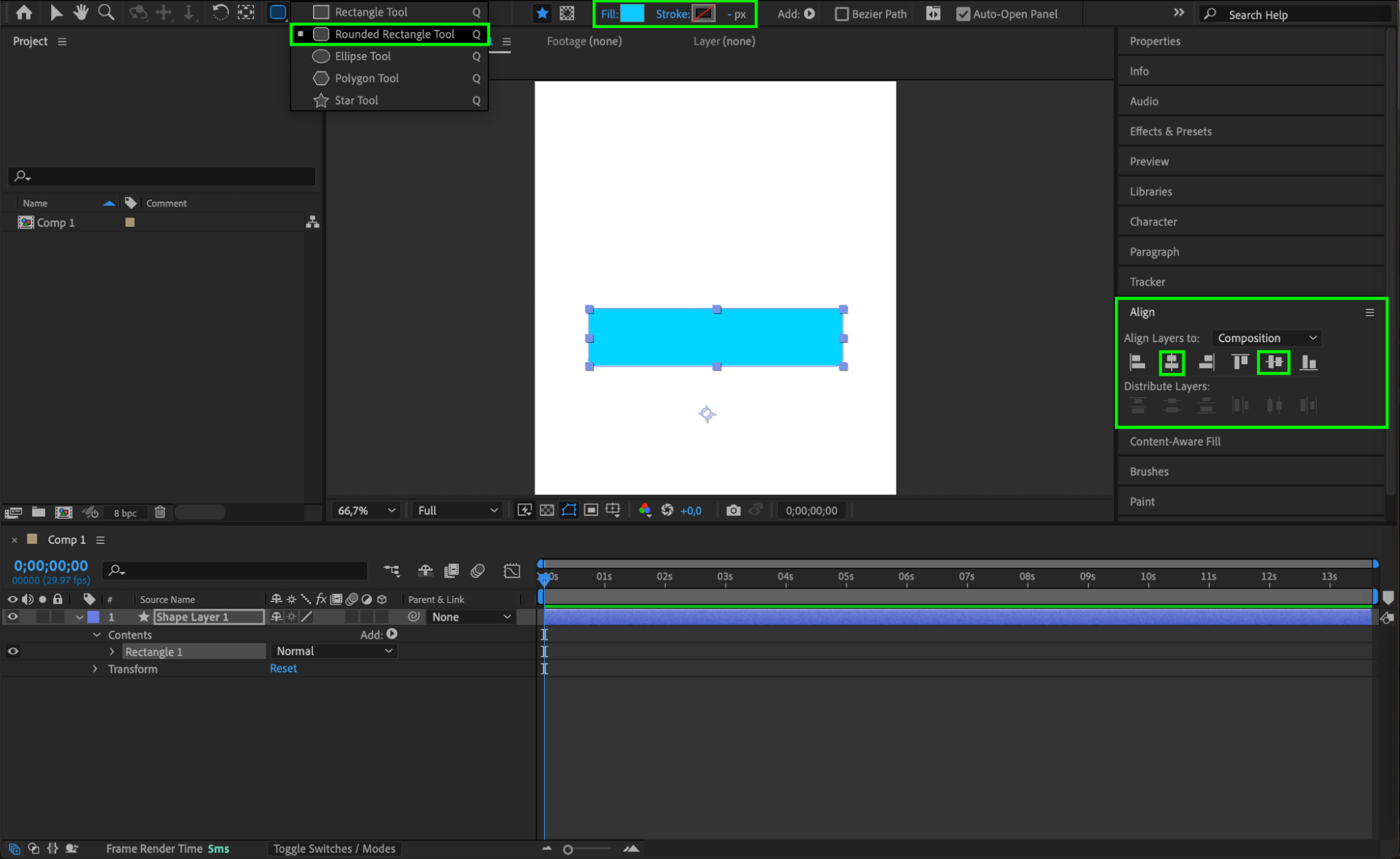 Select the Rounded Rectangle Tool (Q) and draw a rectangle. Set the Fill Color to blue and the Stroke to none. Use the Align Panel to center the shape horizontally and vertically within the composition.