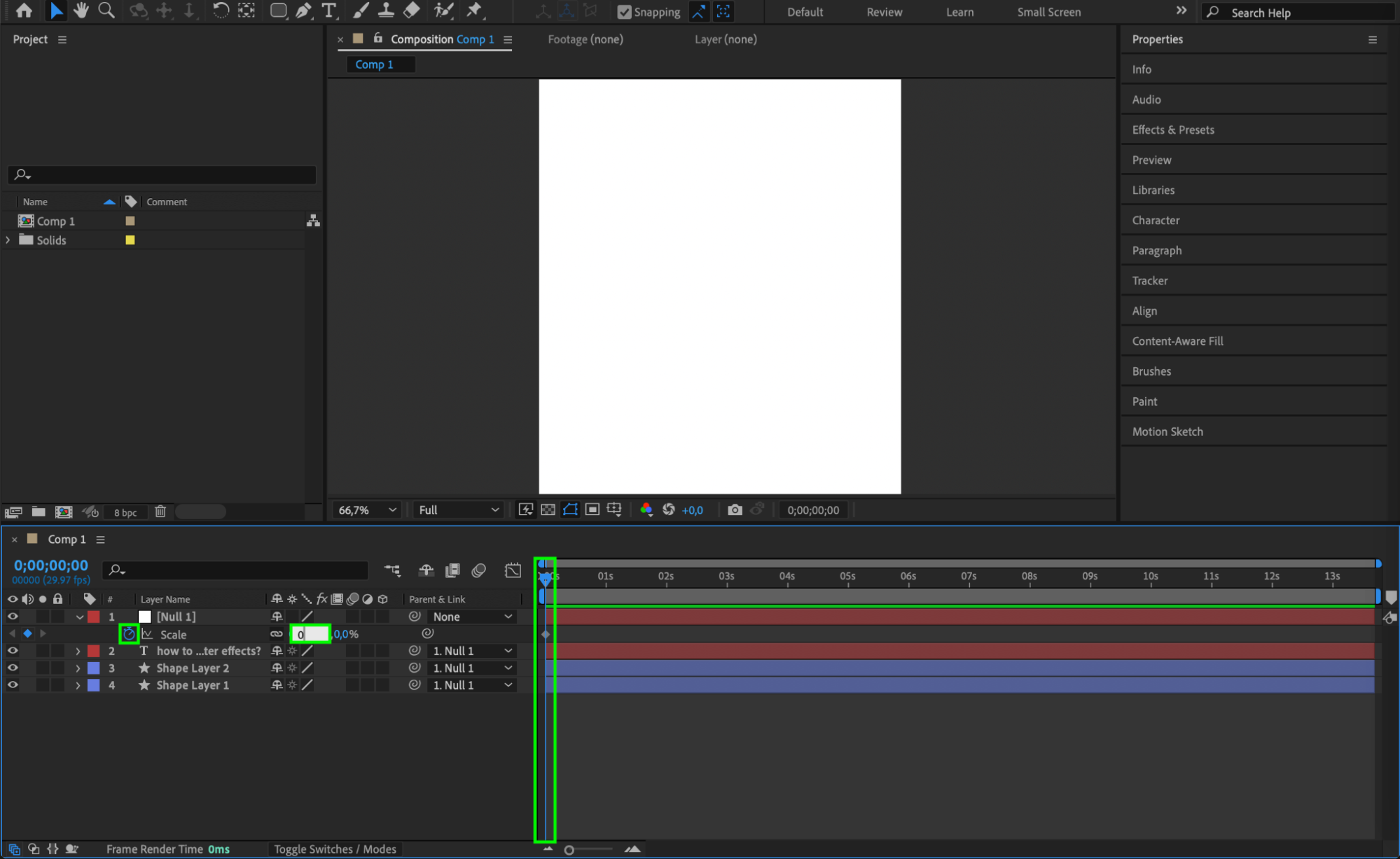 Select the Null Object and open the Transform properties. Set a keyframe for Scale at 0% at the start of the timeline. Move to the middle of the composition and change the scale to 100%.