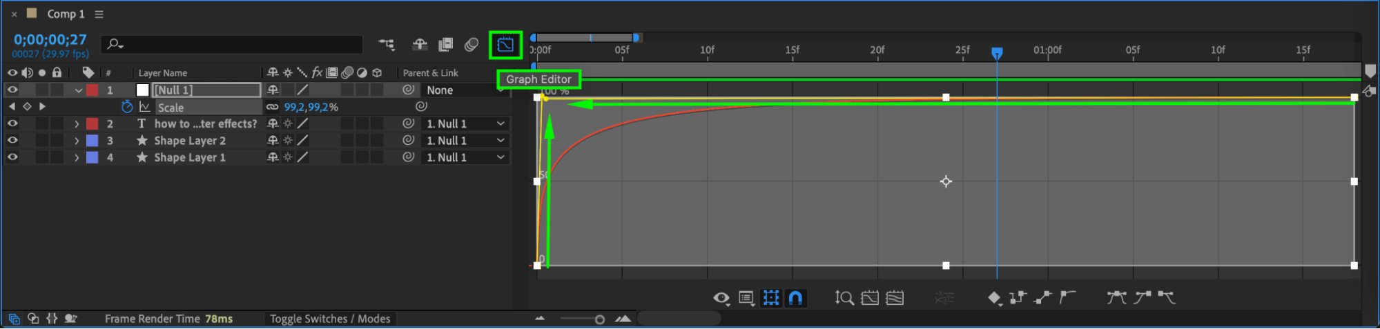 Select both scale keyframes and press F9 to apply Easy Ease. Open the Graph Editor and adjust the curve to create a smoother pop-up motion with a slight bounce effect.