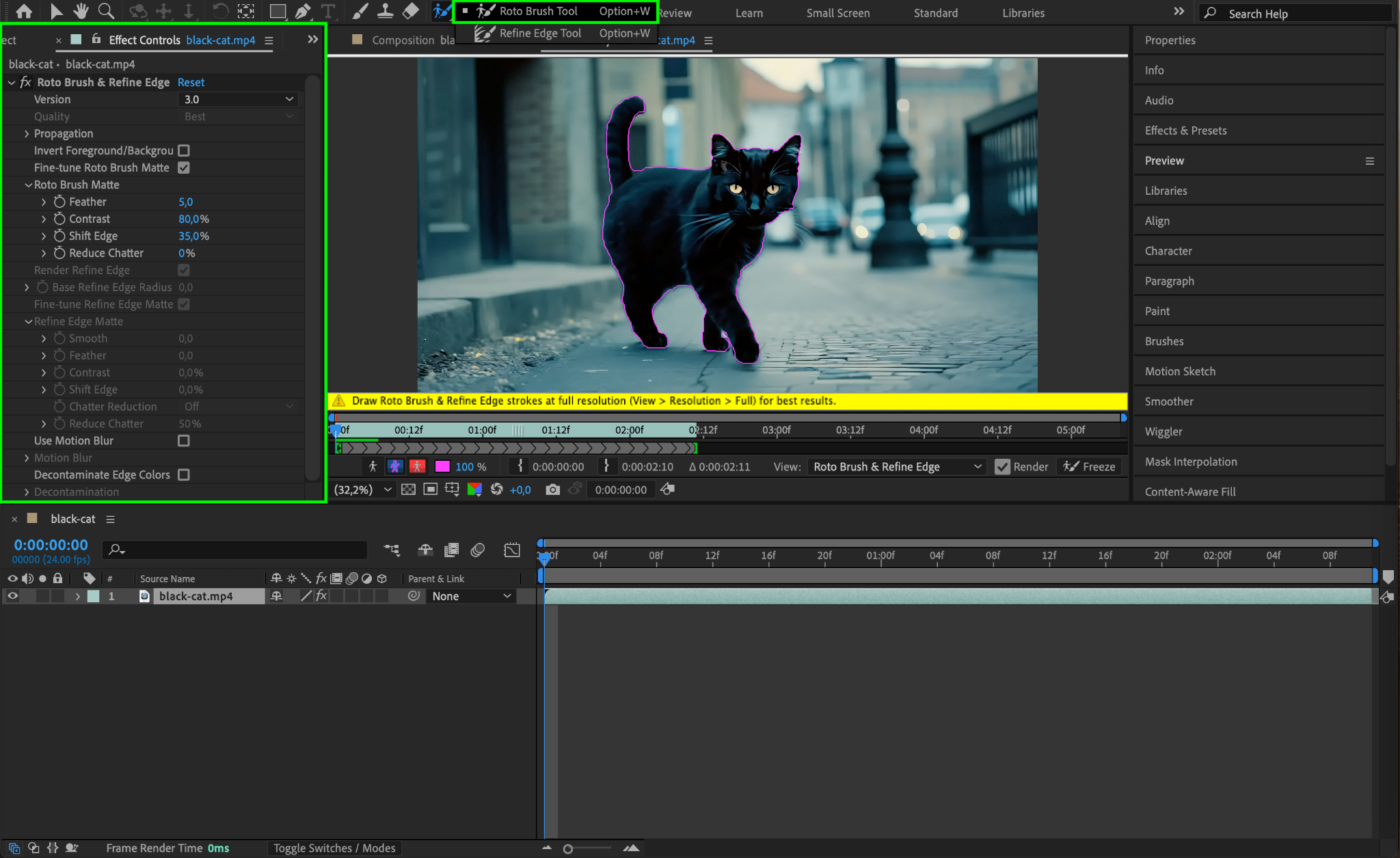 Use the Roto Brush Tool (Alt/Option + W) to select the foreground object or subject in your footage by tracing it in the Layer panel. Duplicate the footage layer (Ctrl/Cmd + D) and rename the duplicate as “Background.” On the original layer, click Freeze to lock the Roto Brush selection. Move the duplicated layer below the original in the timeline and remove the Roto Brush effect from the Background layer to restore the full background, keeping the foreground isolated on the original layer.