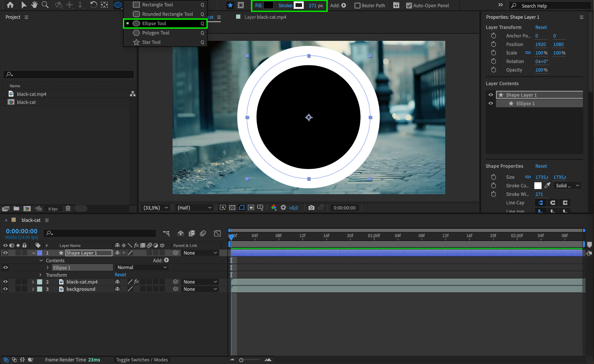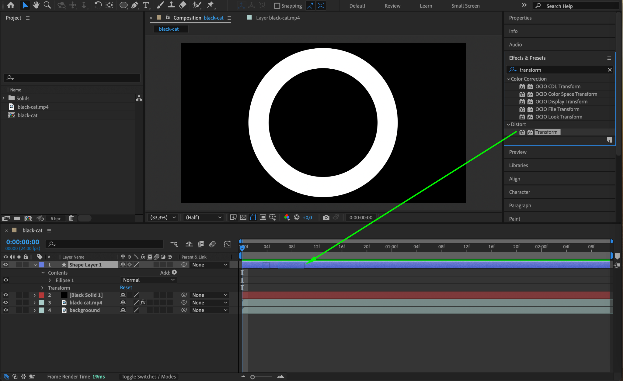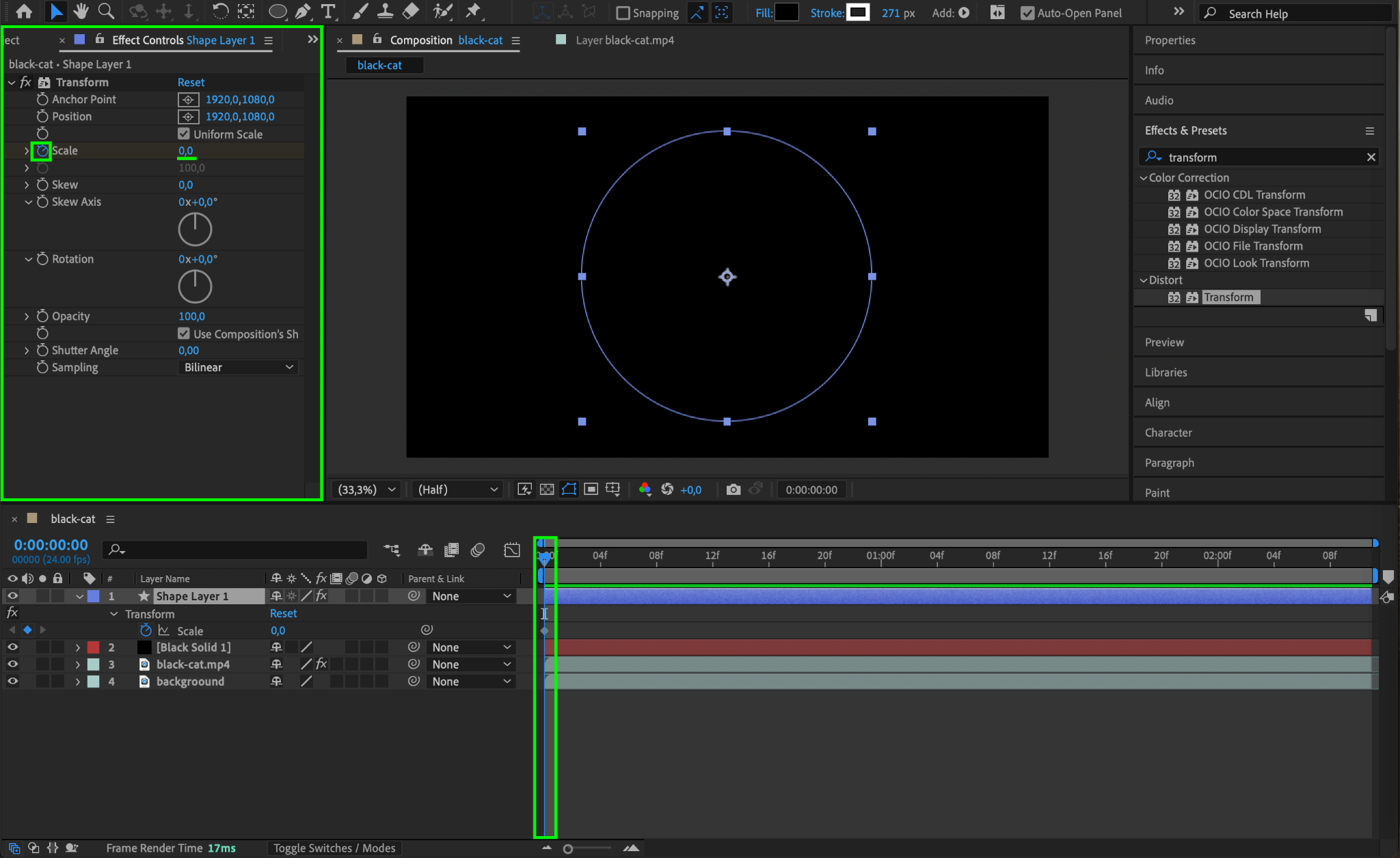 Go to Layer > New > Solid and create a black solid layer. Place it below the shape layer. Select the shape layer and apply the Transform effect from the Effects & Presets panel. Animate the Scale property from 0 at the start of the timeline to 261 at the end.