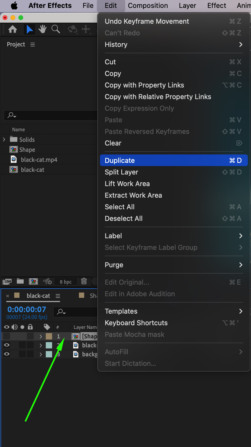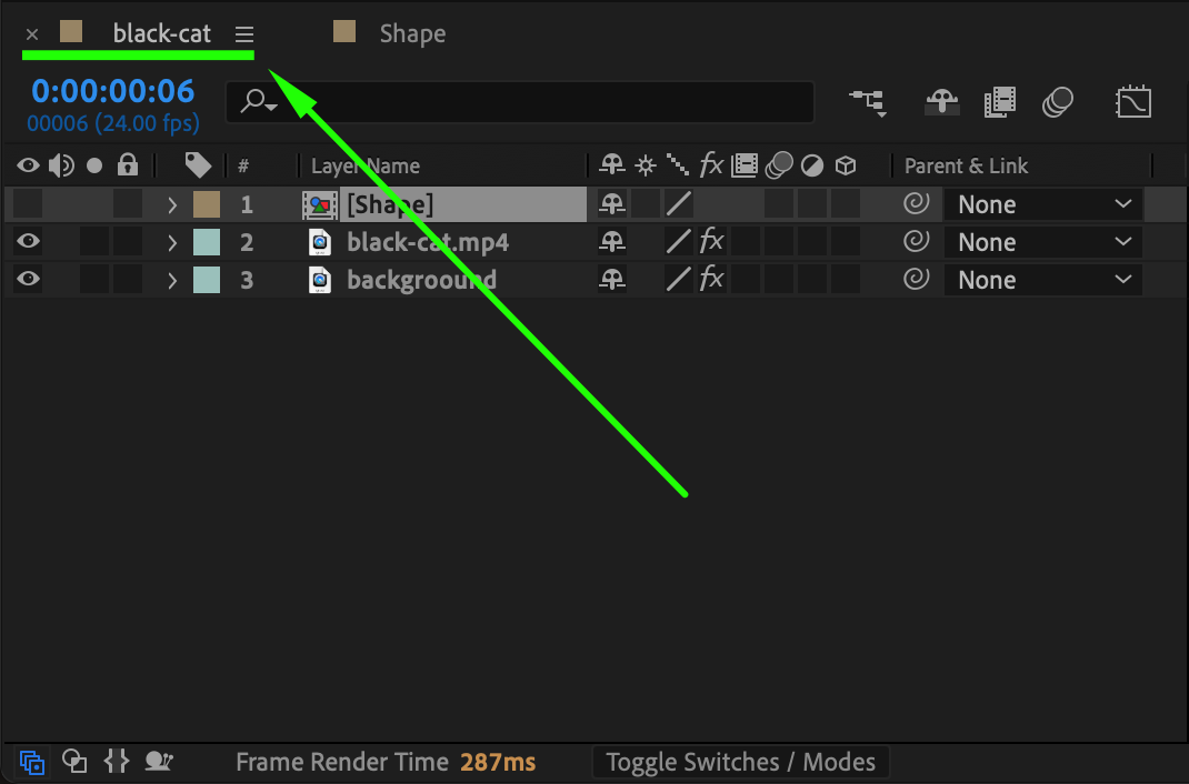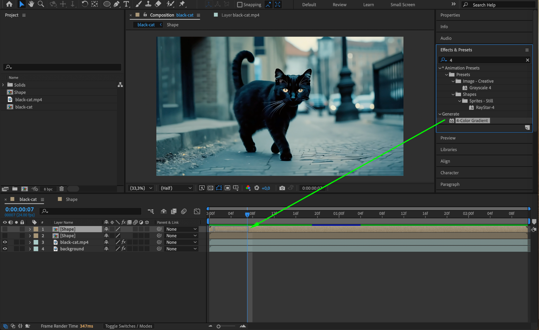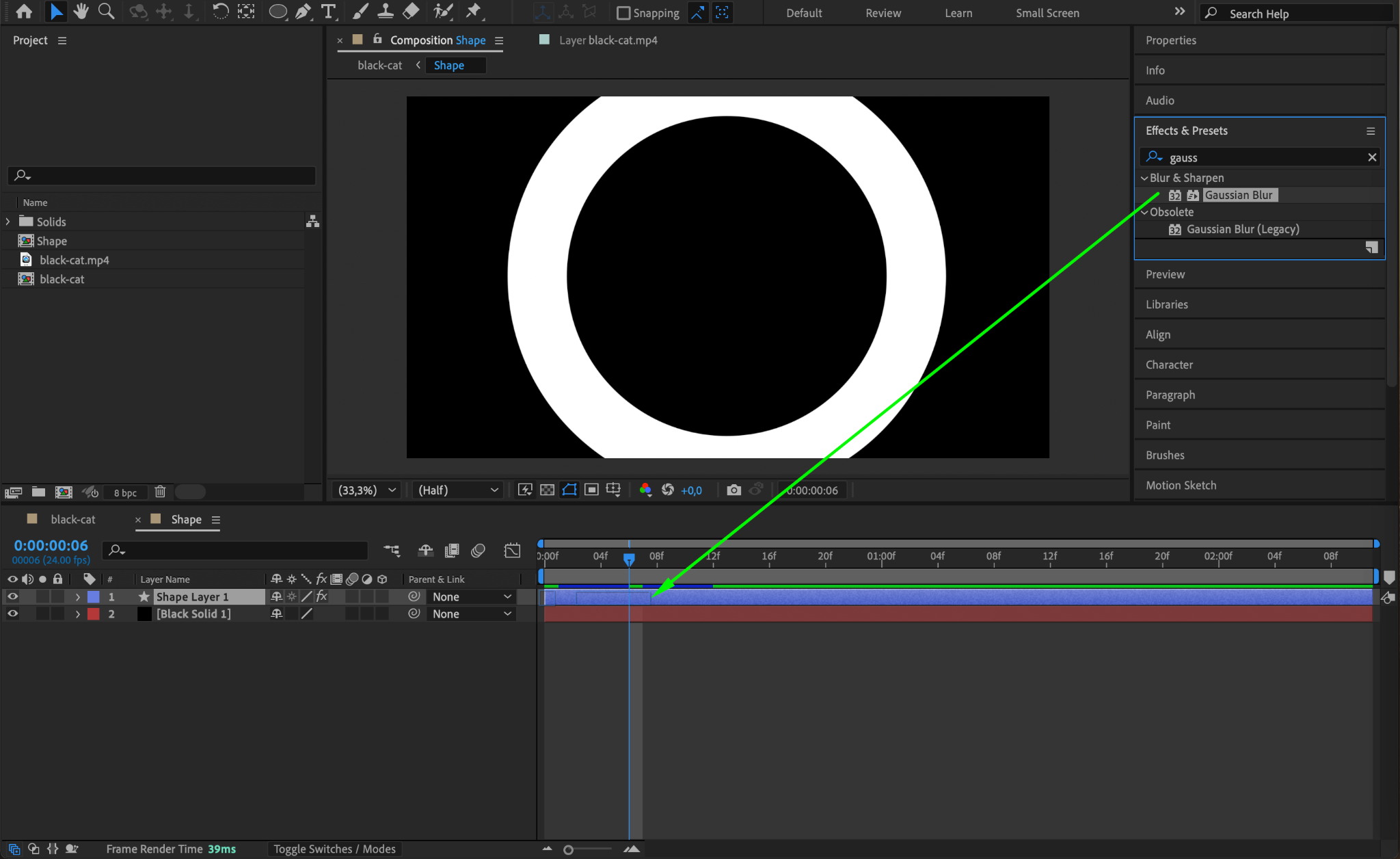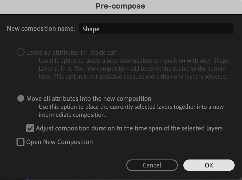 Select the black solid and shape layer, then pre-compose them (Right-click > Pre-compose) and name it “Shape.”