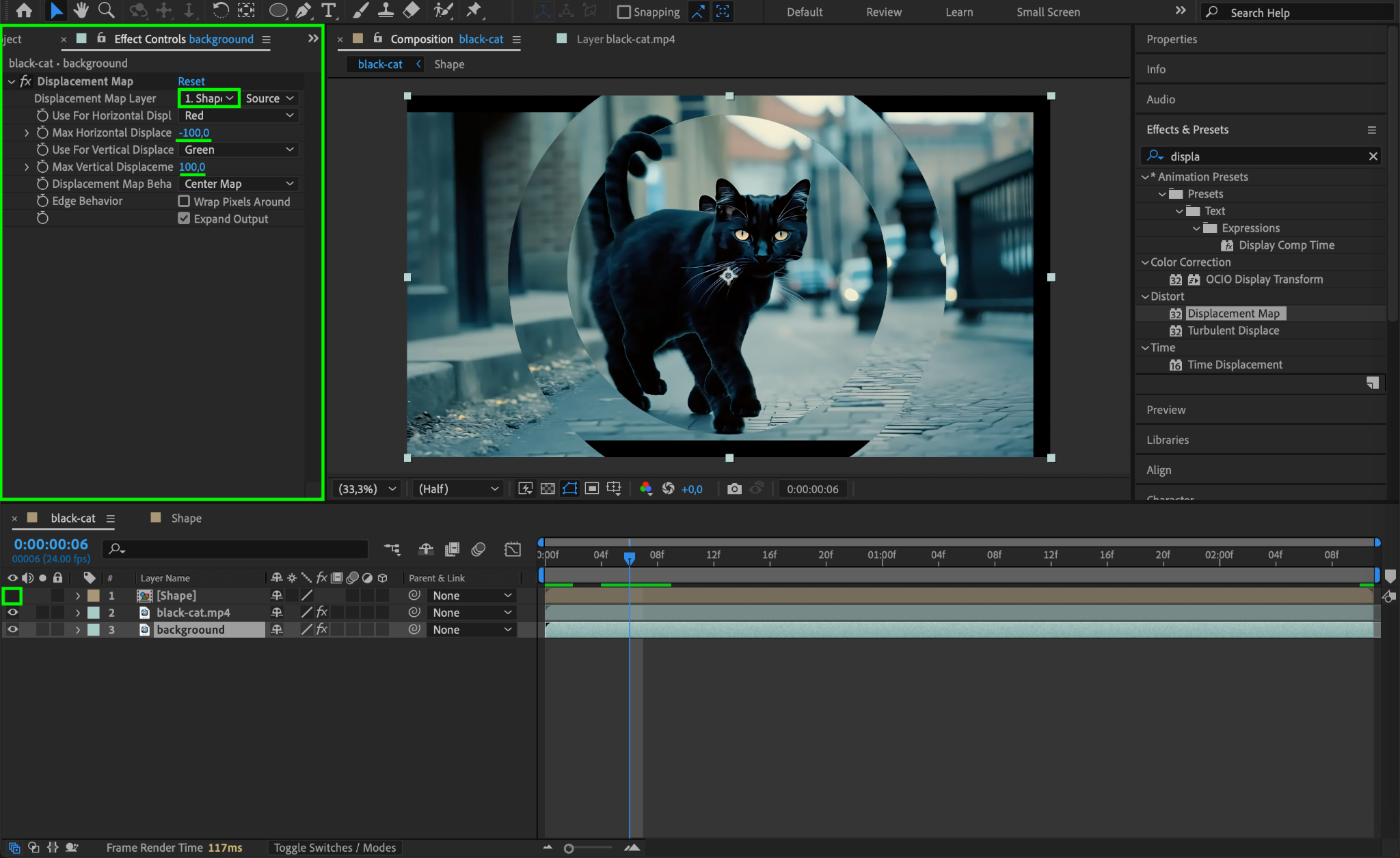 On the background footage layer, add the Displacement Map effect. Set the Displacement Map Layer to the “Shape” composition, then adjust the Max Horizontal Displacement to -100 and the Max Vertical Displacement to 100. Make the “Shape” composition layer invisible in the timeline.