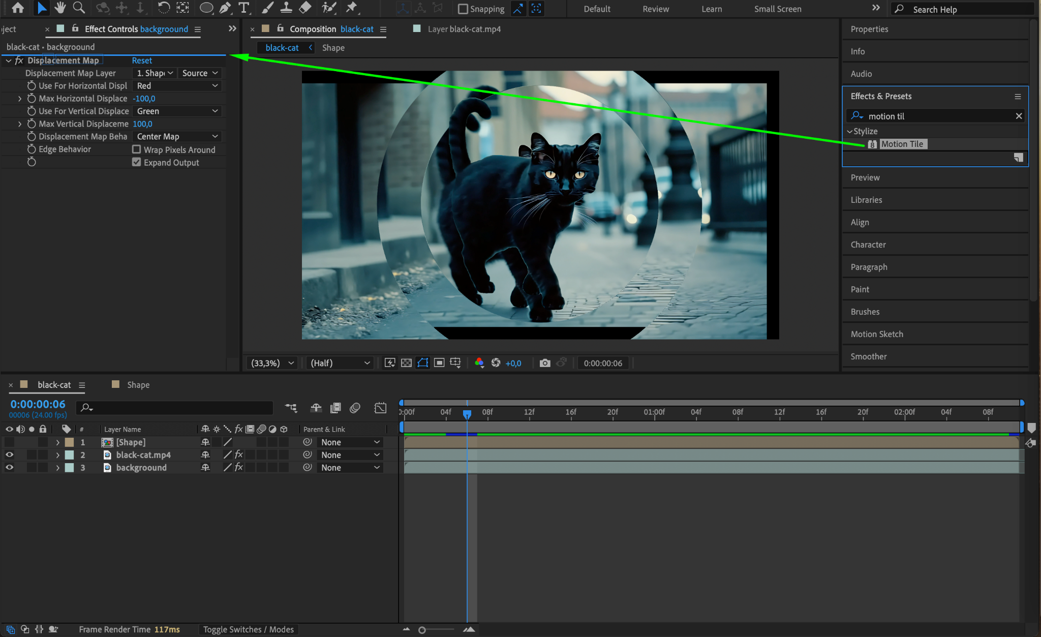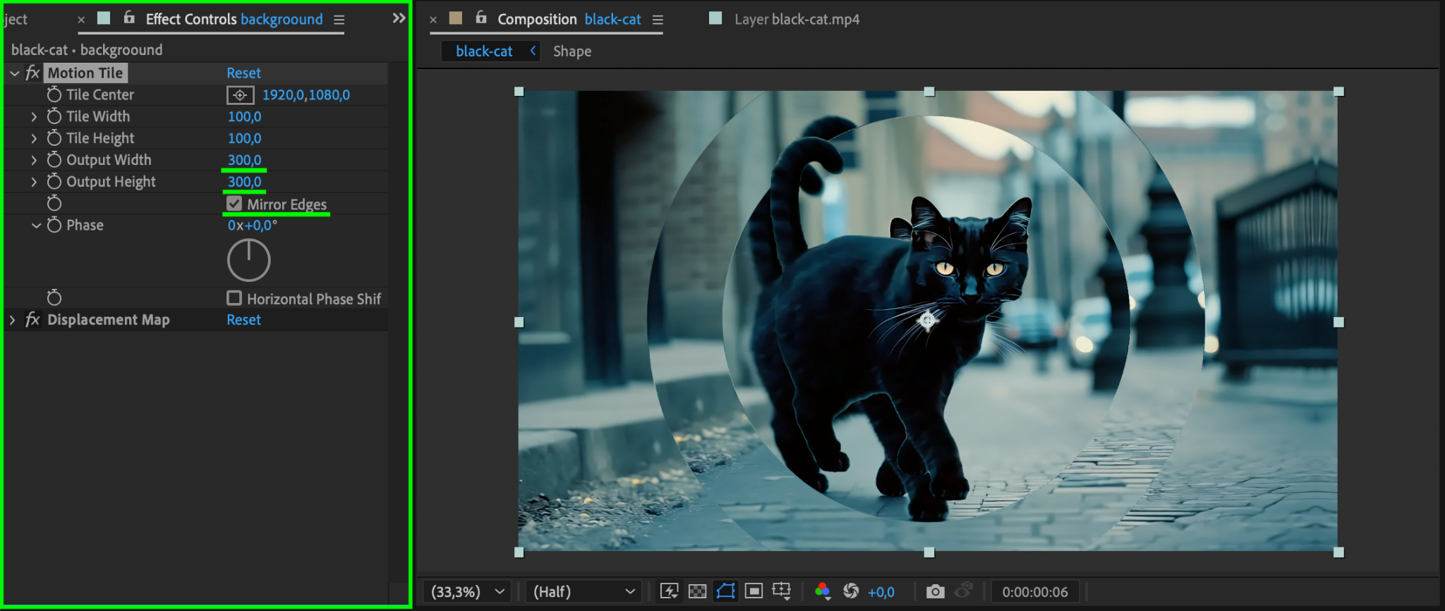 On the background layer, add the Motion Tile effect and place it above the Displacement Map. Set the Output Width and Output Height to 300 and enable Mirror Edges. This ensures seamless tiling of the background as it’s distorted.