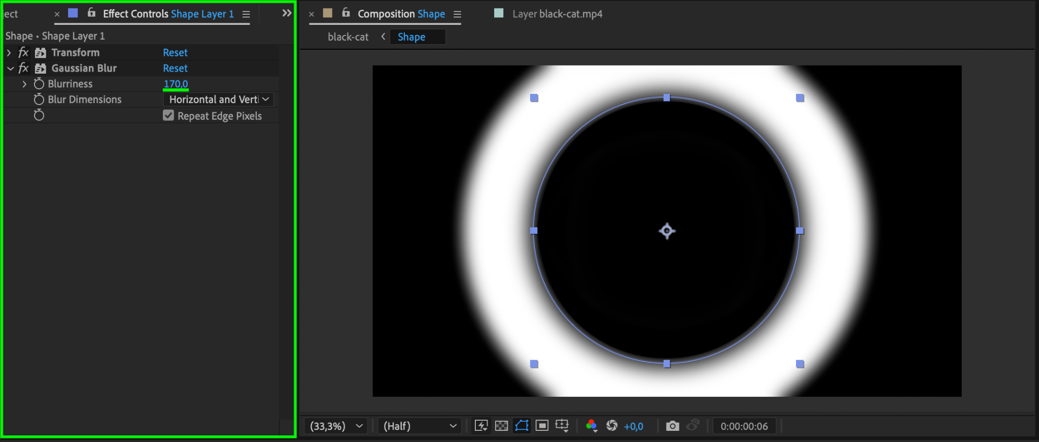 Double-click the “Shape” pre-composition to open it. Apply the Gaussian Blur effect to the shape layer and set the Bluriness to 170. This softens the edges of the shockwave for a smoother effect.