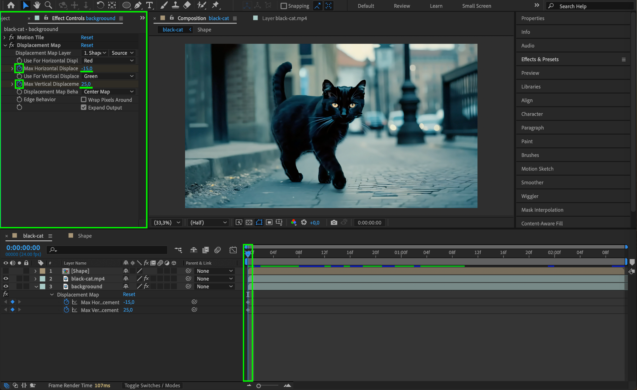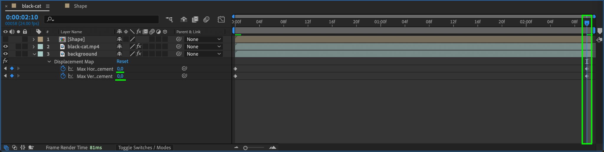 Return to the main composition. Open the Effect Controls panel for the background layer. Animate the Max Horizontal Displacement from -15 at the start to 0 at the end. Similarly, animate the Max Vertical Displacement from 25 at the start to 0 at the end.