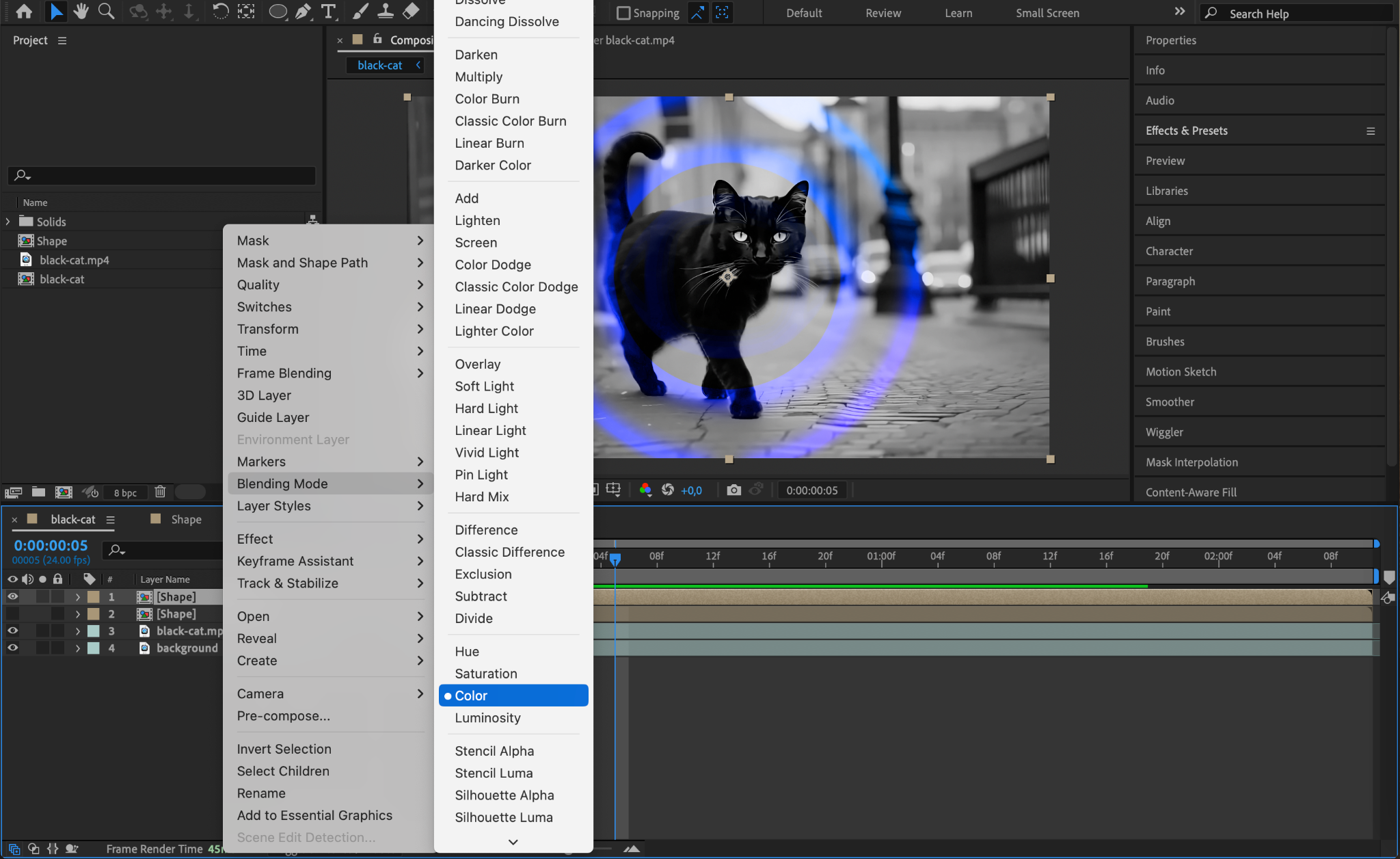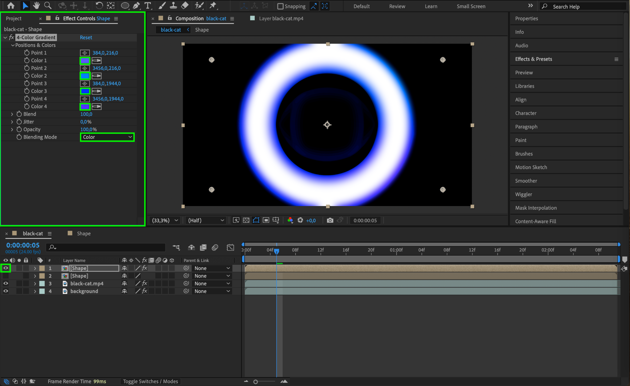 Duplicate the “Shape” composition and make it visible. Apply the 4-Color Gradient effect to this layer. Adjust the colors as desired to create a vibrant shockwave. Change the Blending Mode of the layer to Color for an enhanced look.