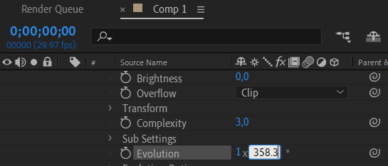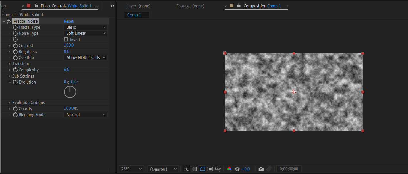 To begin, establish a pristine white solid layer as the foundation for your design. Following this, implement the Fractal Noise effect, a versatile tool renowned for crafting intricate organic textures, notably suitable for simulating smoke.