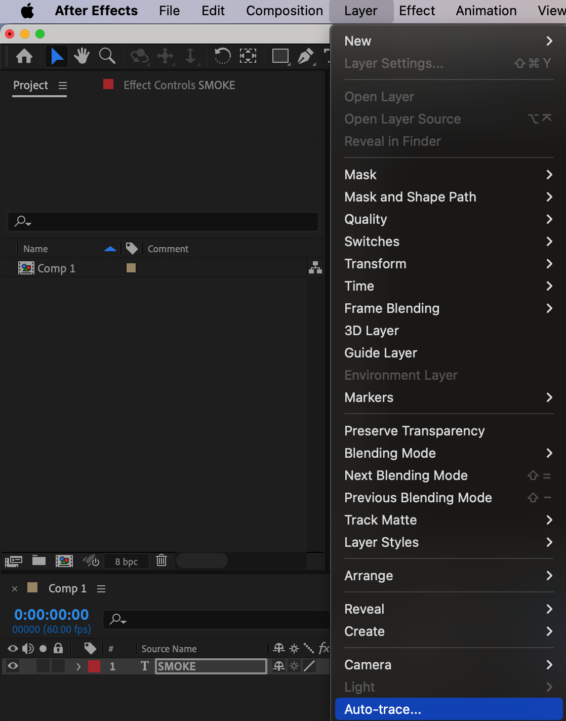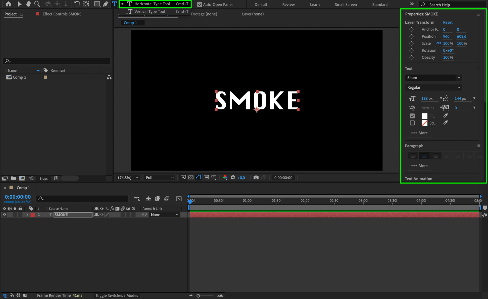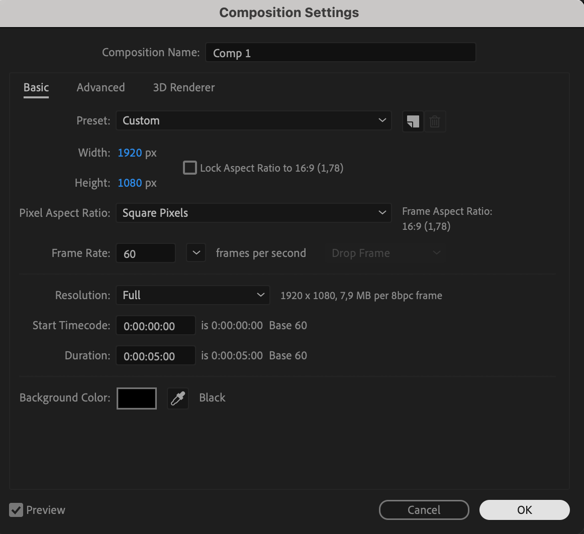 Open After Effects and go to Composition > New Composition. Set your desired resolution, frame rate, and duration. A dark background color often works best to make the smoke stand out.