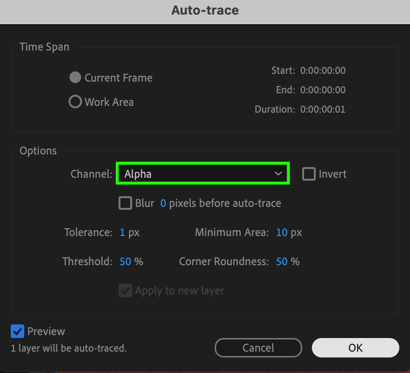 With the text layer selected, go to Layer > Auto-Trace. In the dialog box, set Channel to Alpha and keep the default settings. Click OK to create a new mask based on your text’s shape.
