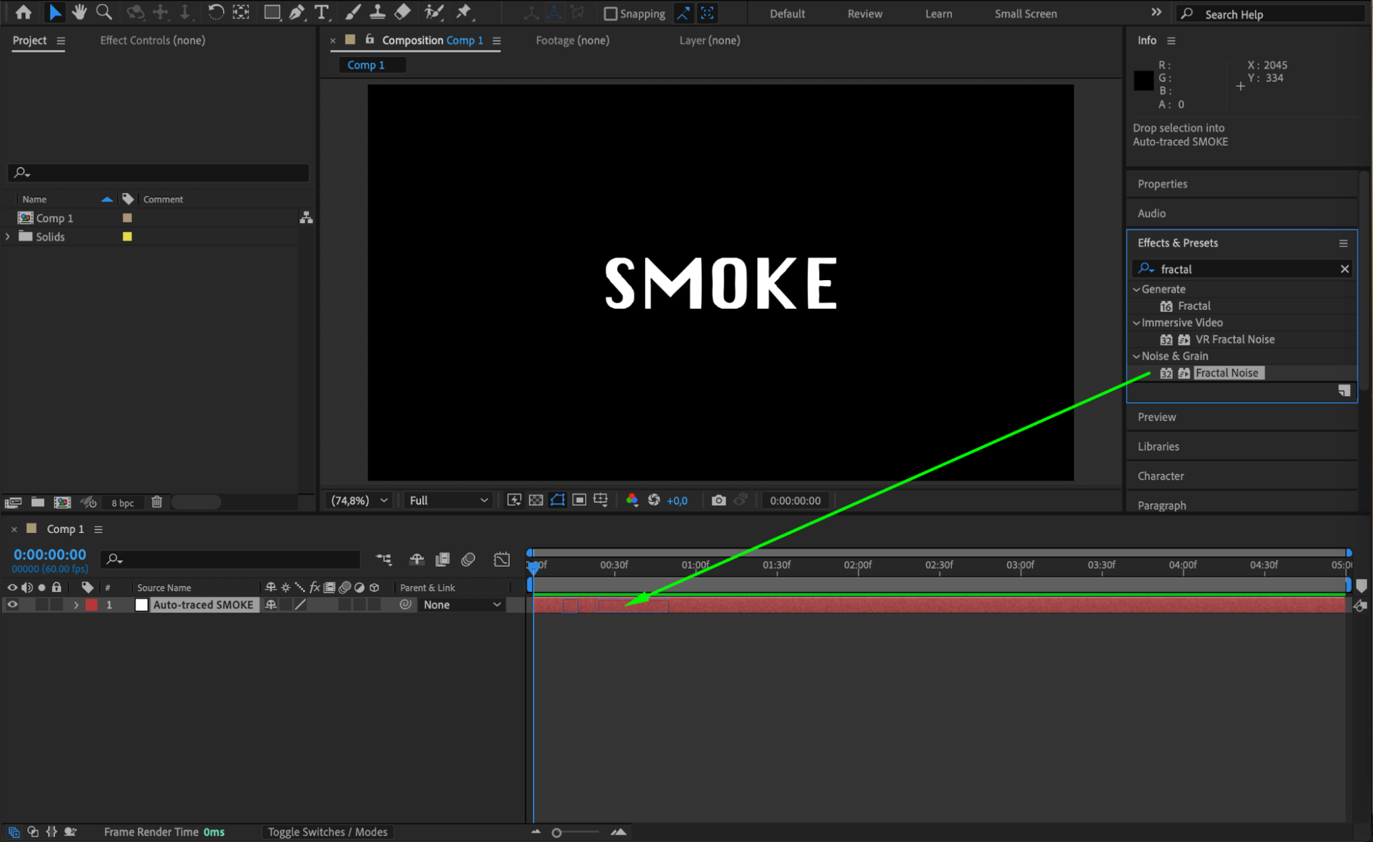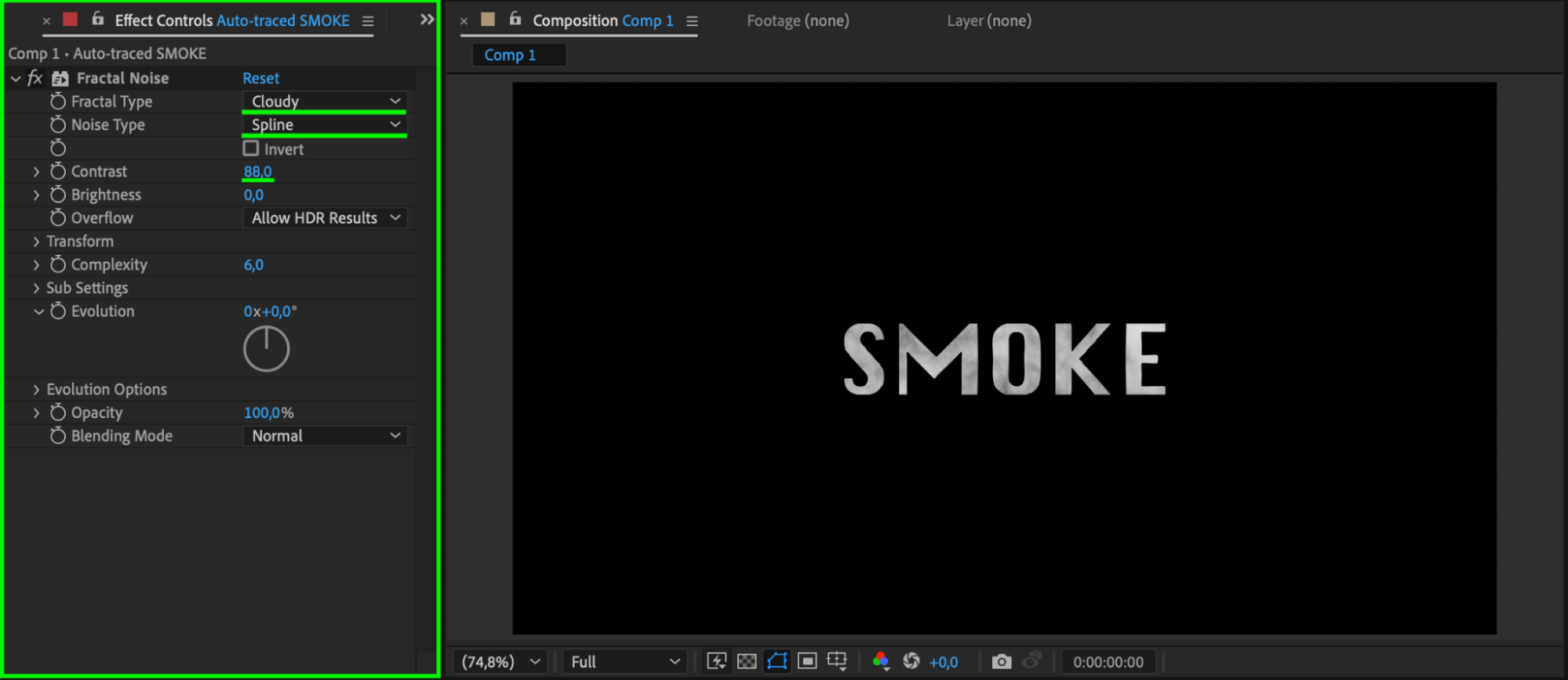 Delete the original text layer – you now have a mask shape layer. Apply Fractal Noise from the Effects & Presets panel. Set Fractal Type to Cloudy, Noise Type to Spline, and adjust Contrast to around 88 to make the smoke texture more defined.
