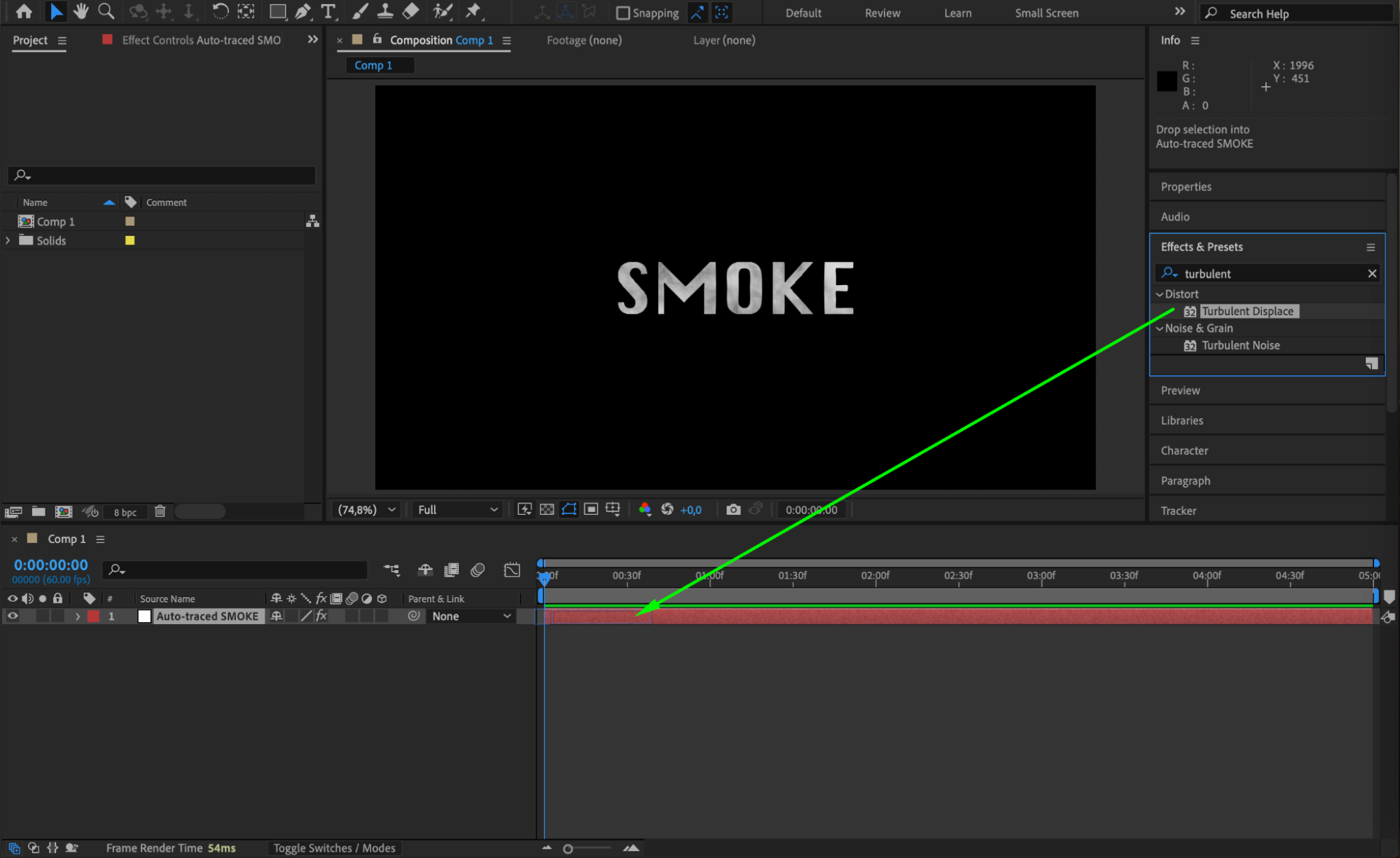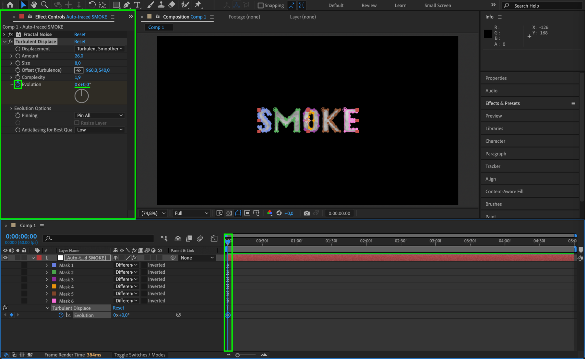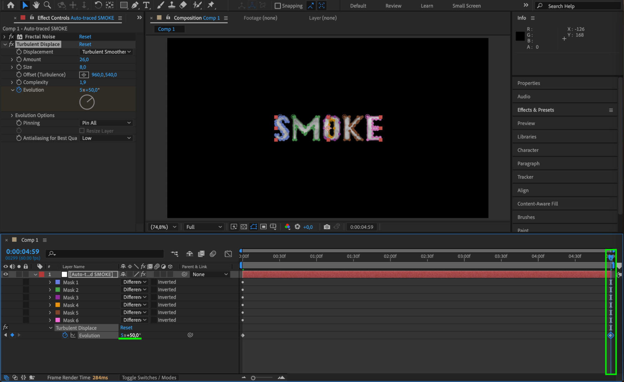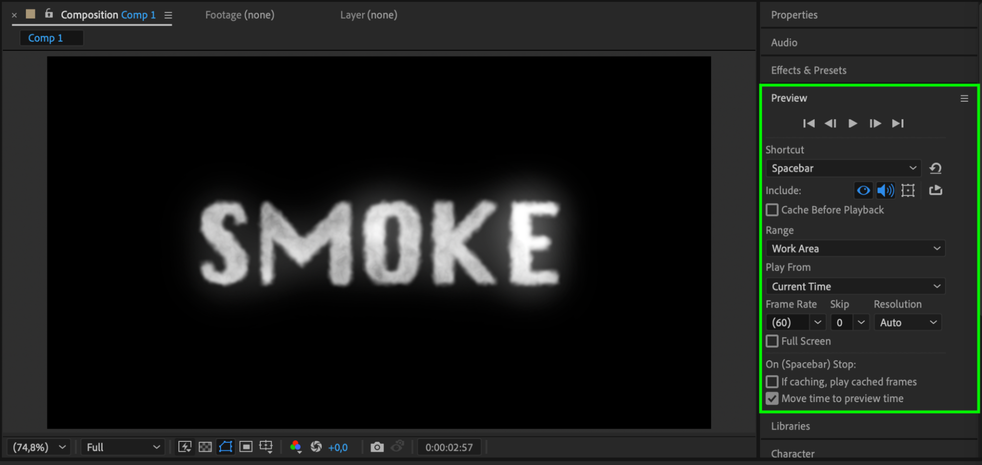 Press Spacebar to preview your animation. You should see the smoke flowing and shifting in the shape of your original text, creating a mesmerizing and cinematic look.