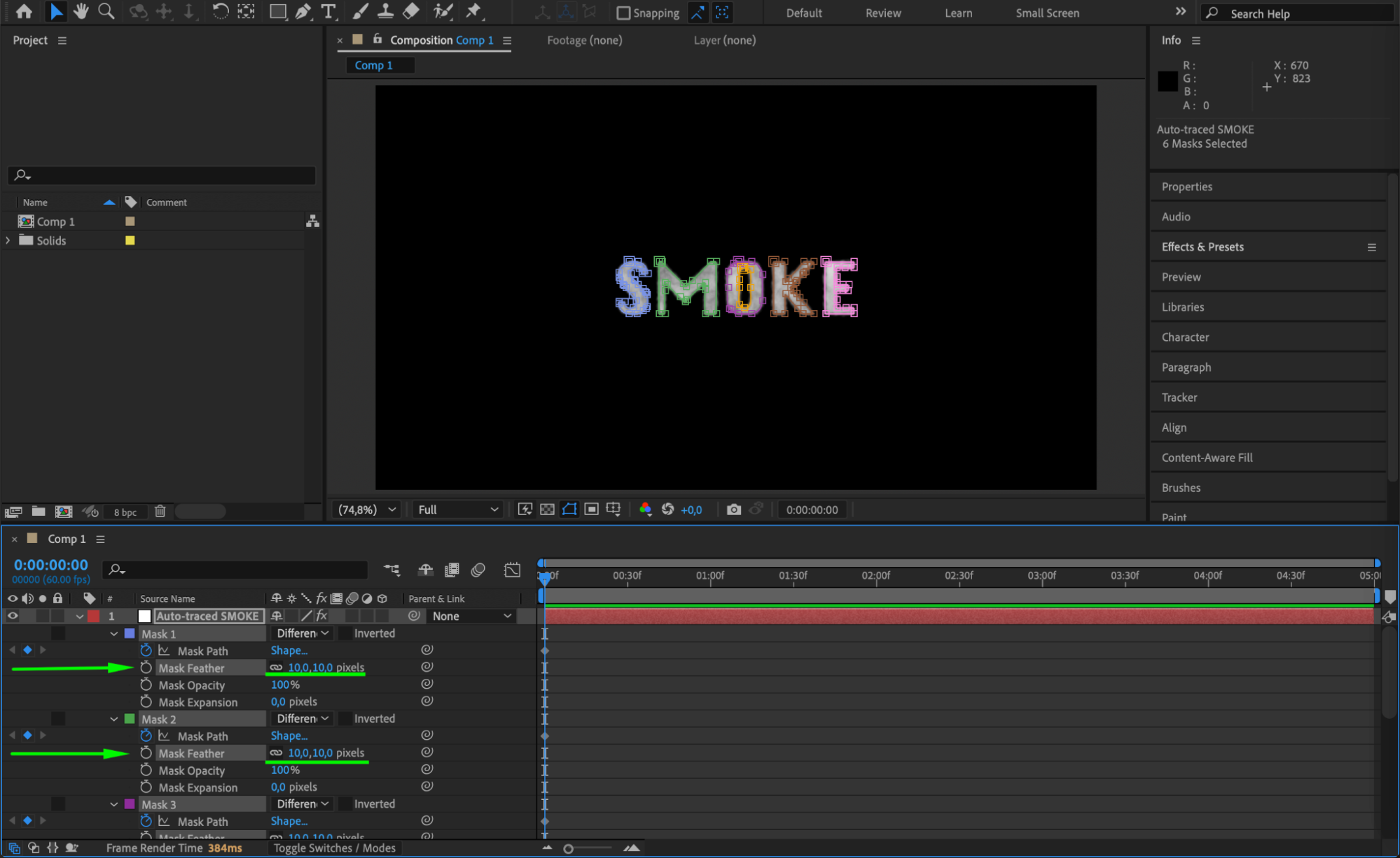 Open the shape layer’s Mask properties and set the Feather value to around 10 for all sides. This smooths out the edges and makes the smoke look more natural and less sharp.