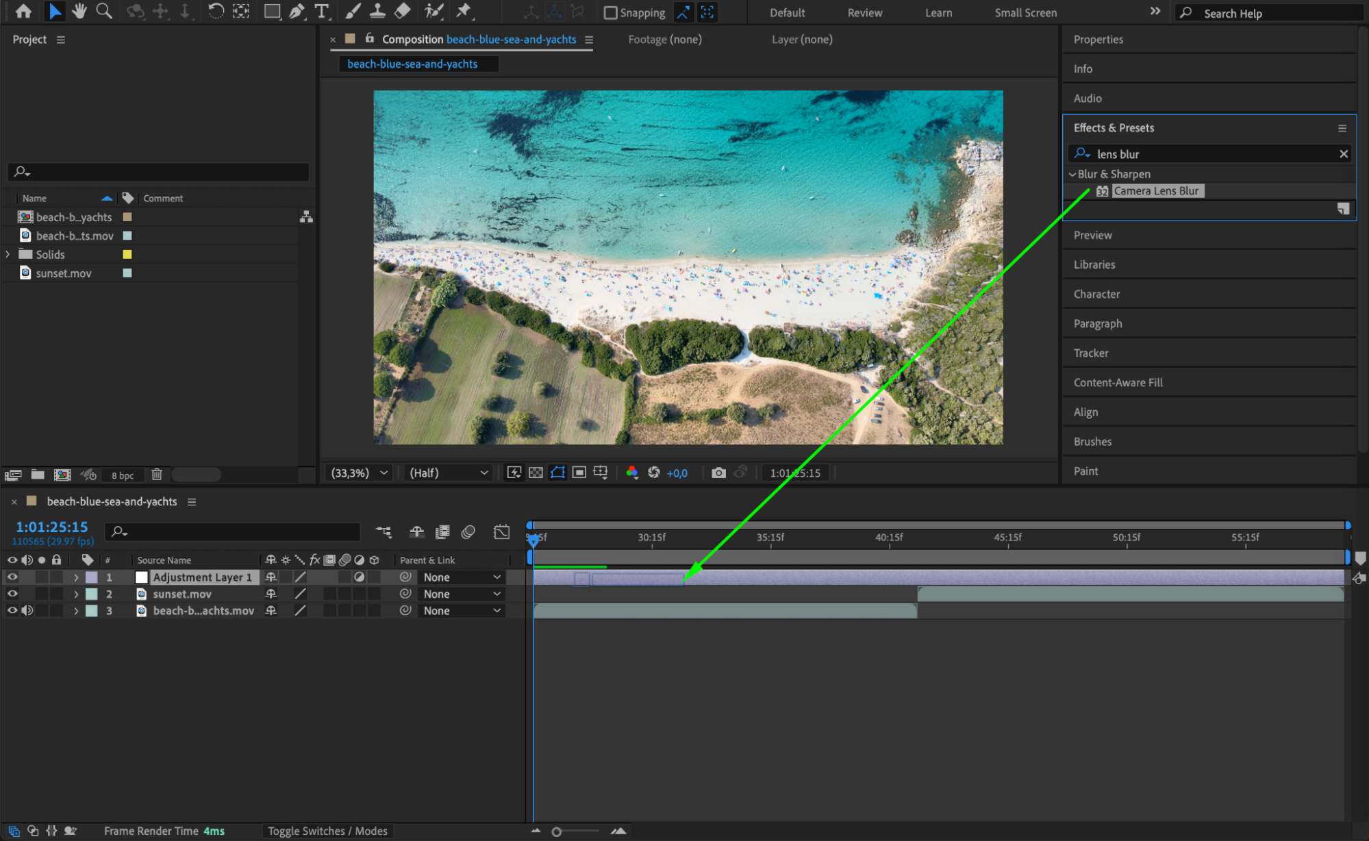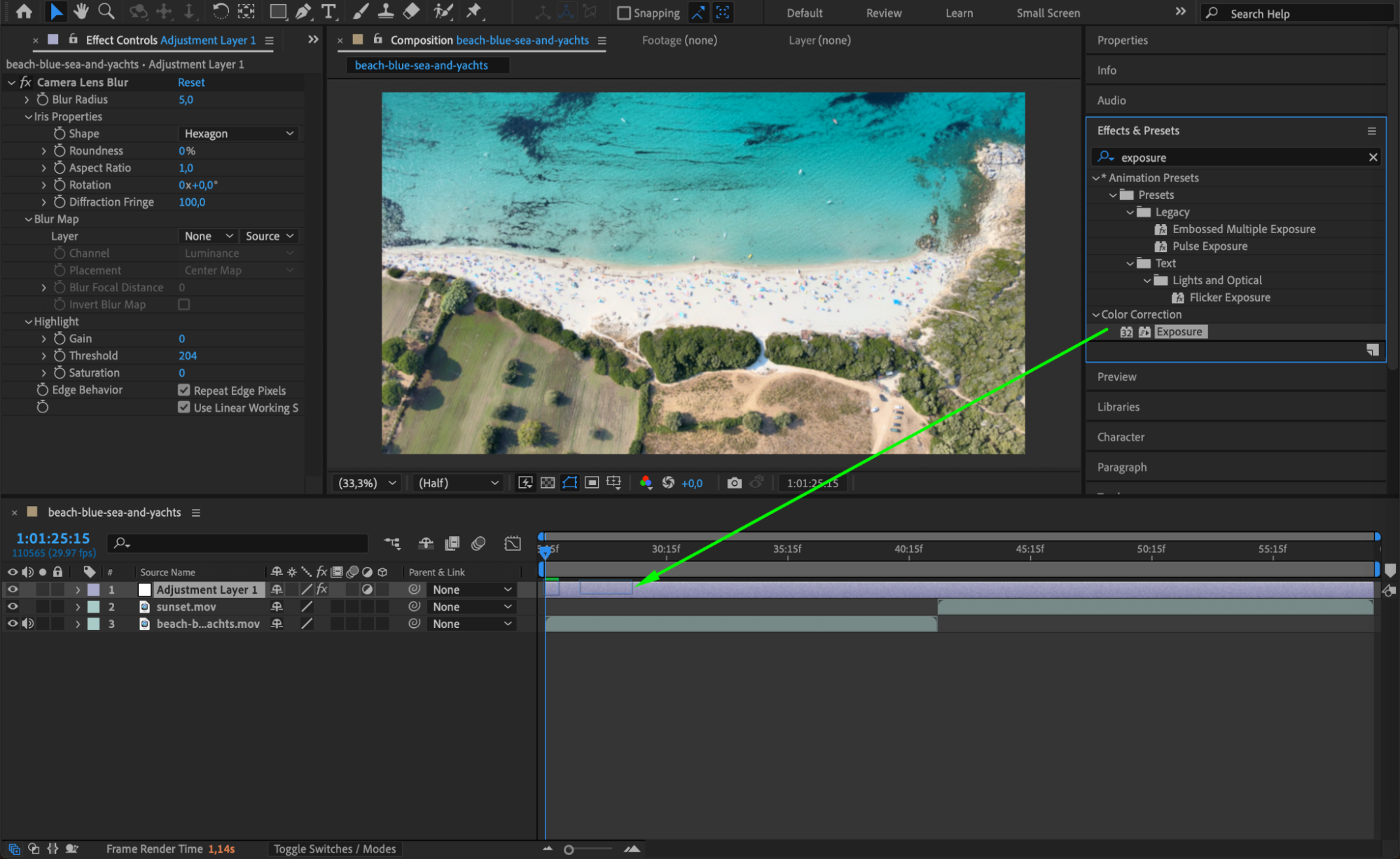 Open the Effects & Presets panel, search for Camera Lens Blur and Exposure, then drag both effects onto the Adjustment Layer. These effects will create the blur transition and simulate a natural exposure change.