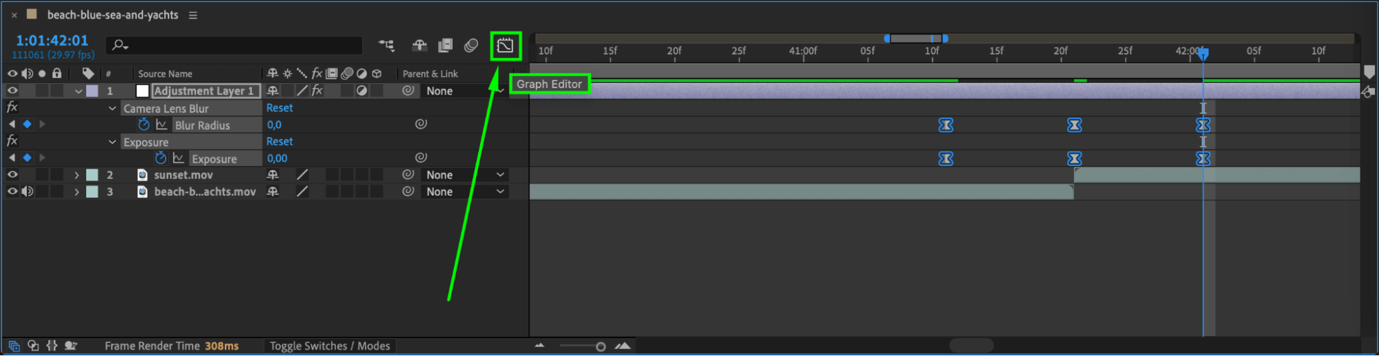 Move the Current Time Indicator (CTI) to the point where the first video ends and the second video begins. Press “Ctrl/Cmd + Shift + Left Arrow” to move slightly backward. Click the stopwatch icons for Blur Radius (Camera Lens Blur) and Exposure to create keyframes with both values set to 0.