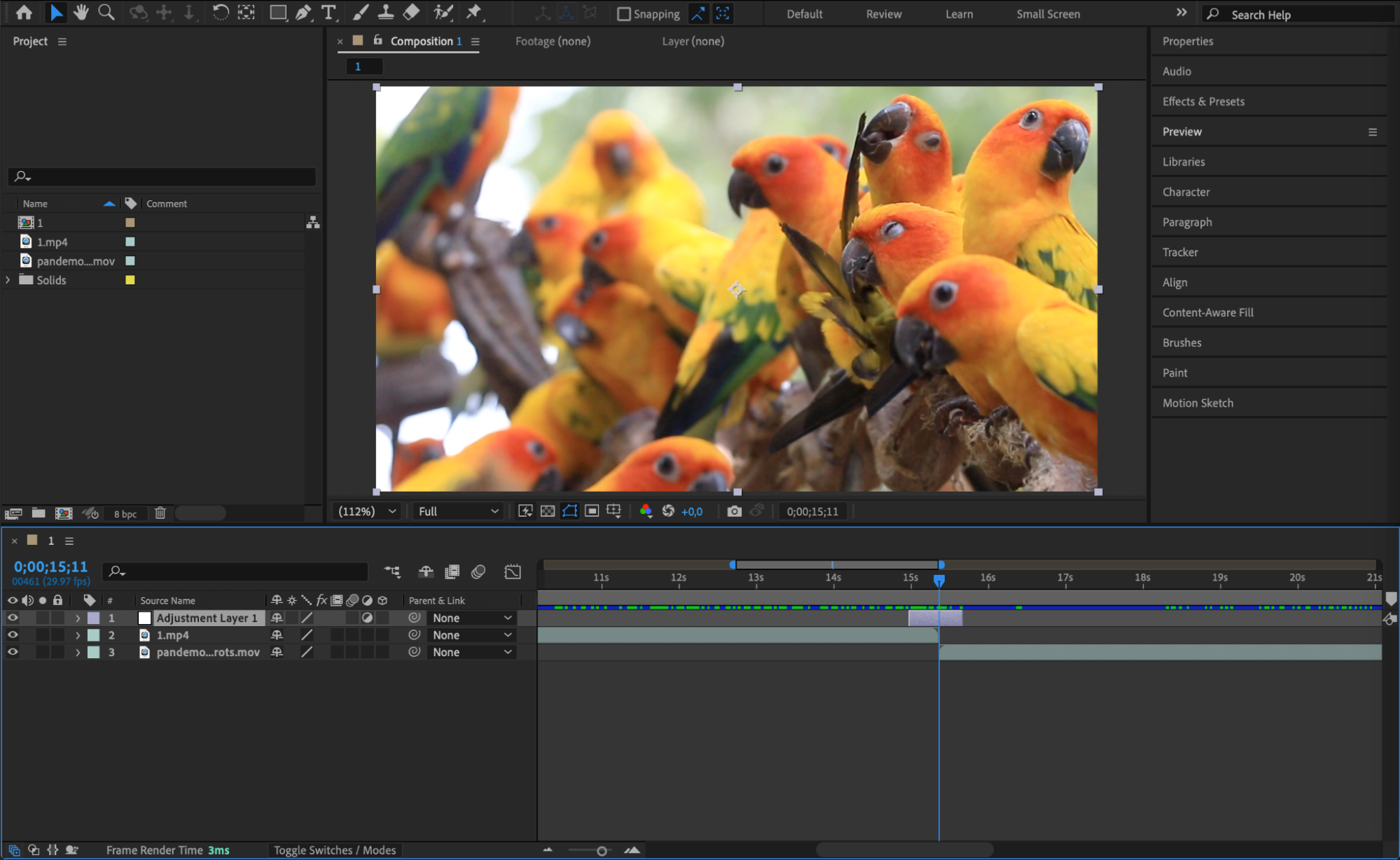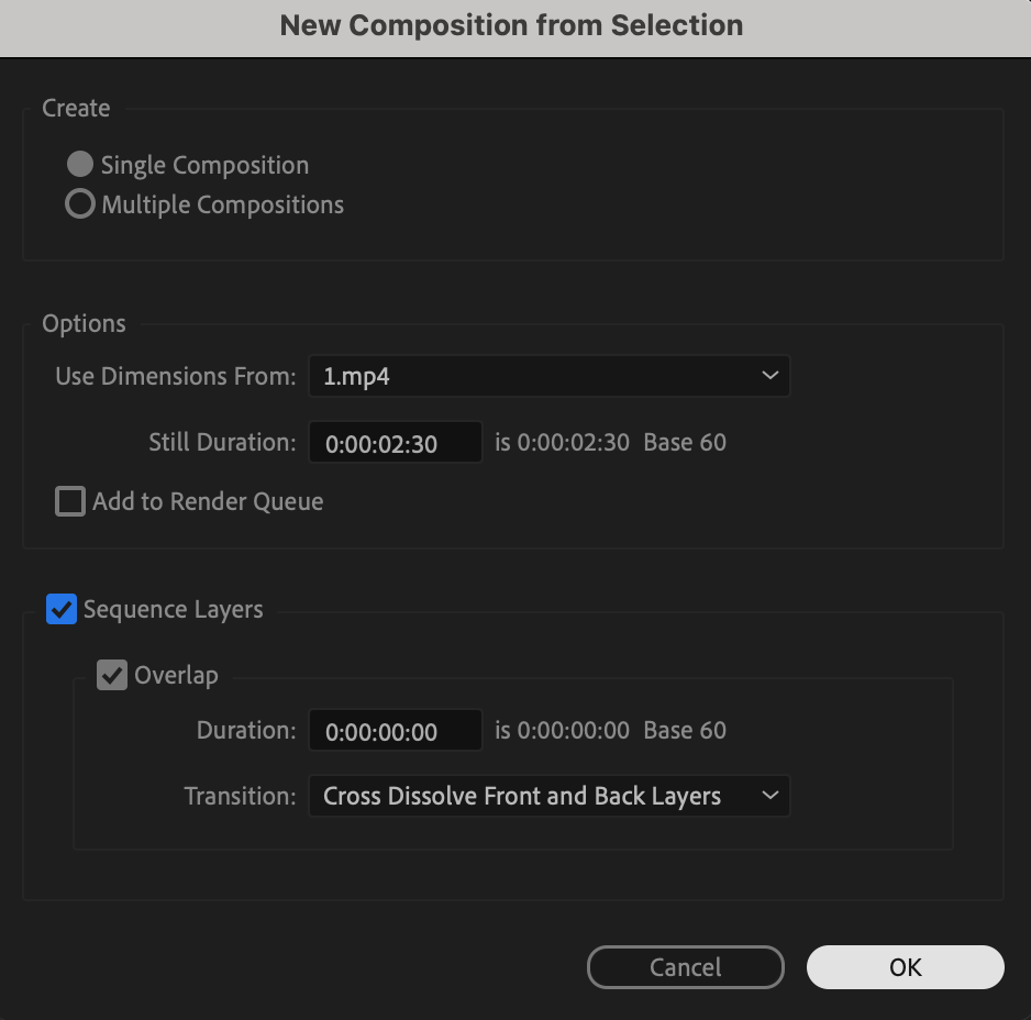 Go to Layer > New > Adjustment Layer. Place this layer exactly between the two video clips. Adjust its duration to about 20 frames so that it equally overlaps the end of the first video and the start of the second.