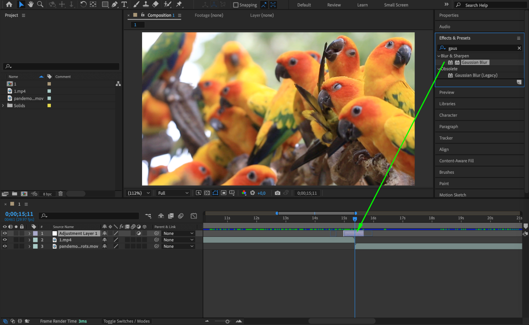 With the adjustment layer selected, go to Effect > Blur & Sharpen > Gaussian Blur. This effect will give your zoom motion a natural blur that enhances the smoothness of the transition.