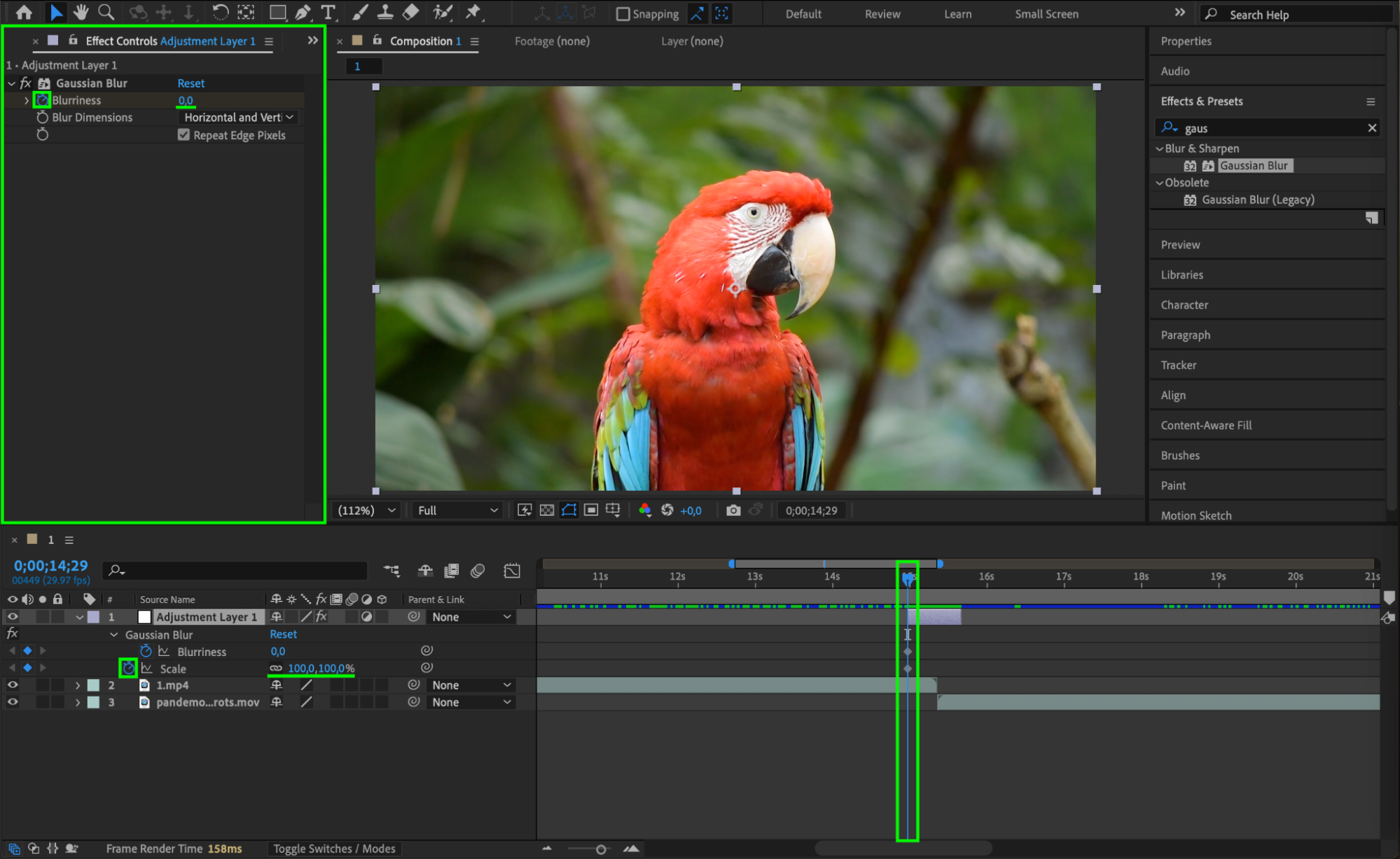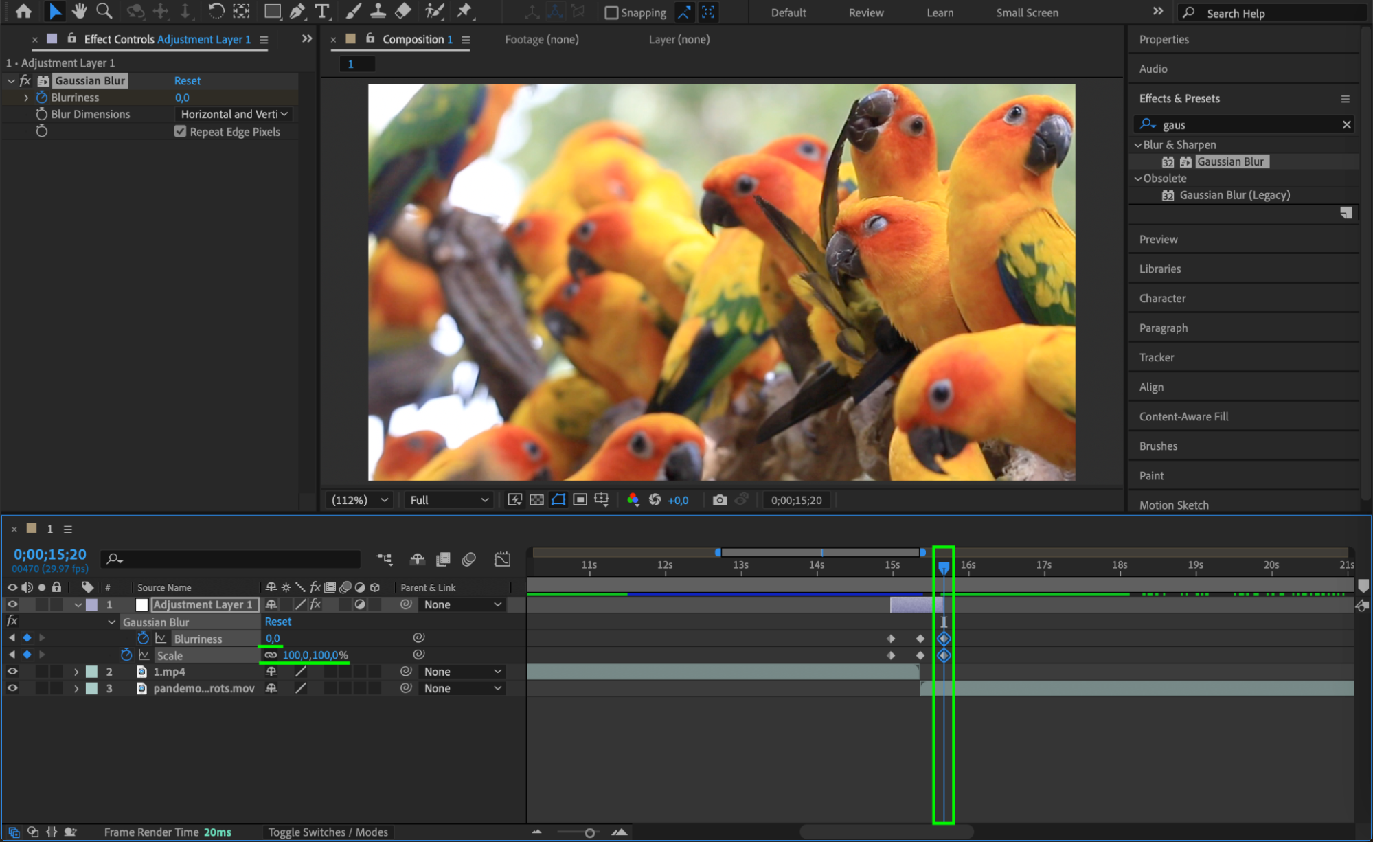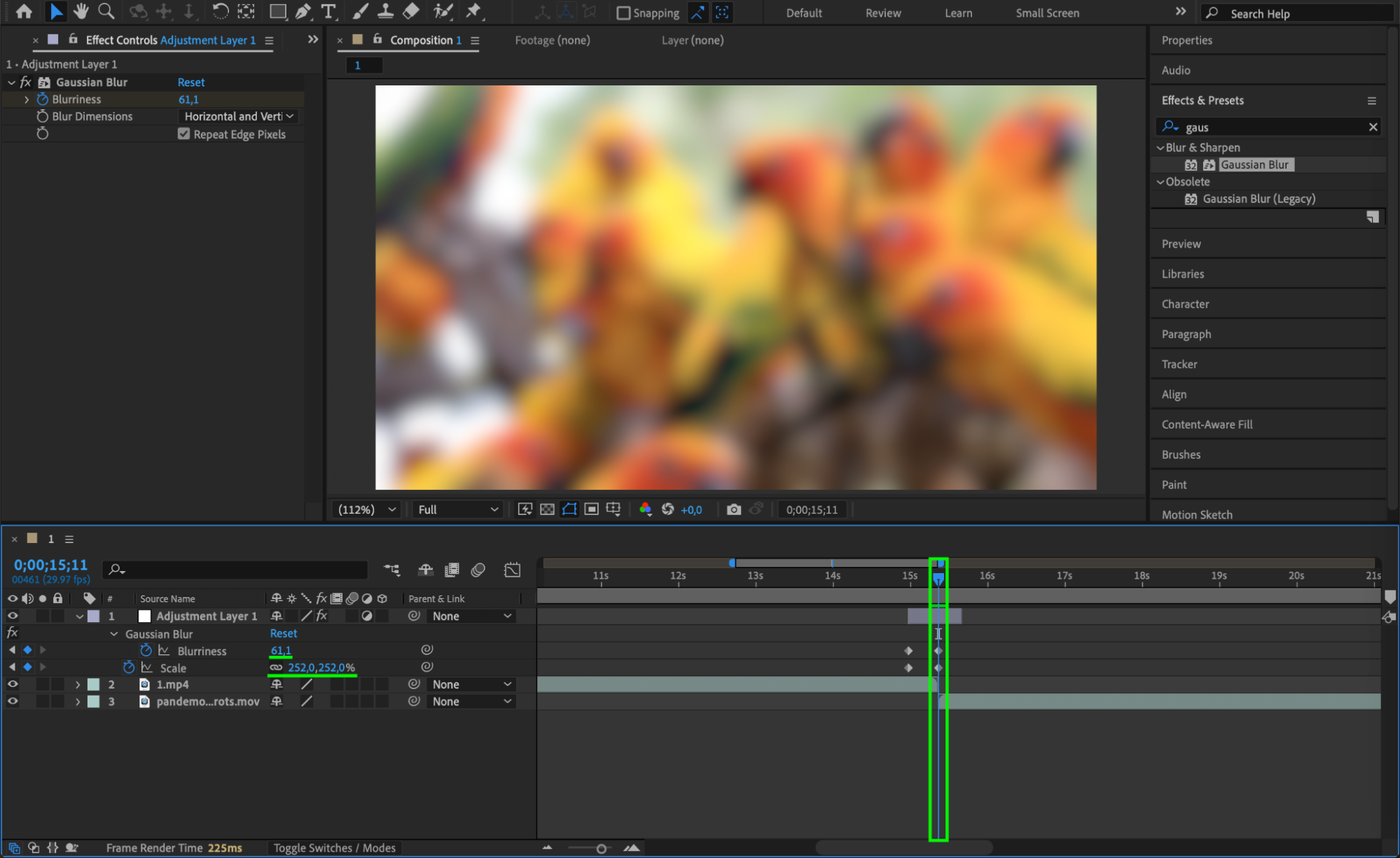 At the start of the adjustment layer, set Blurriness to 0 and Scale to 100%. Click the stopwatches to add keyframes. Then go to the middle of the adjustment layer, and set Blurriness to around 60 and Scale to around 250%. This creates the zoom-in and blur effect.