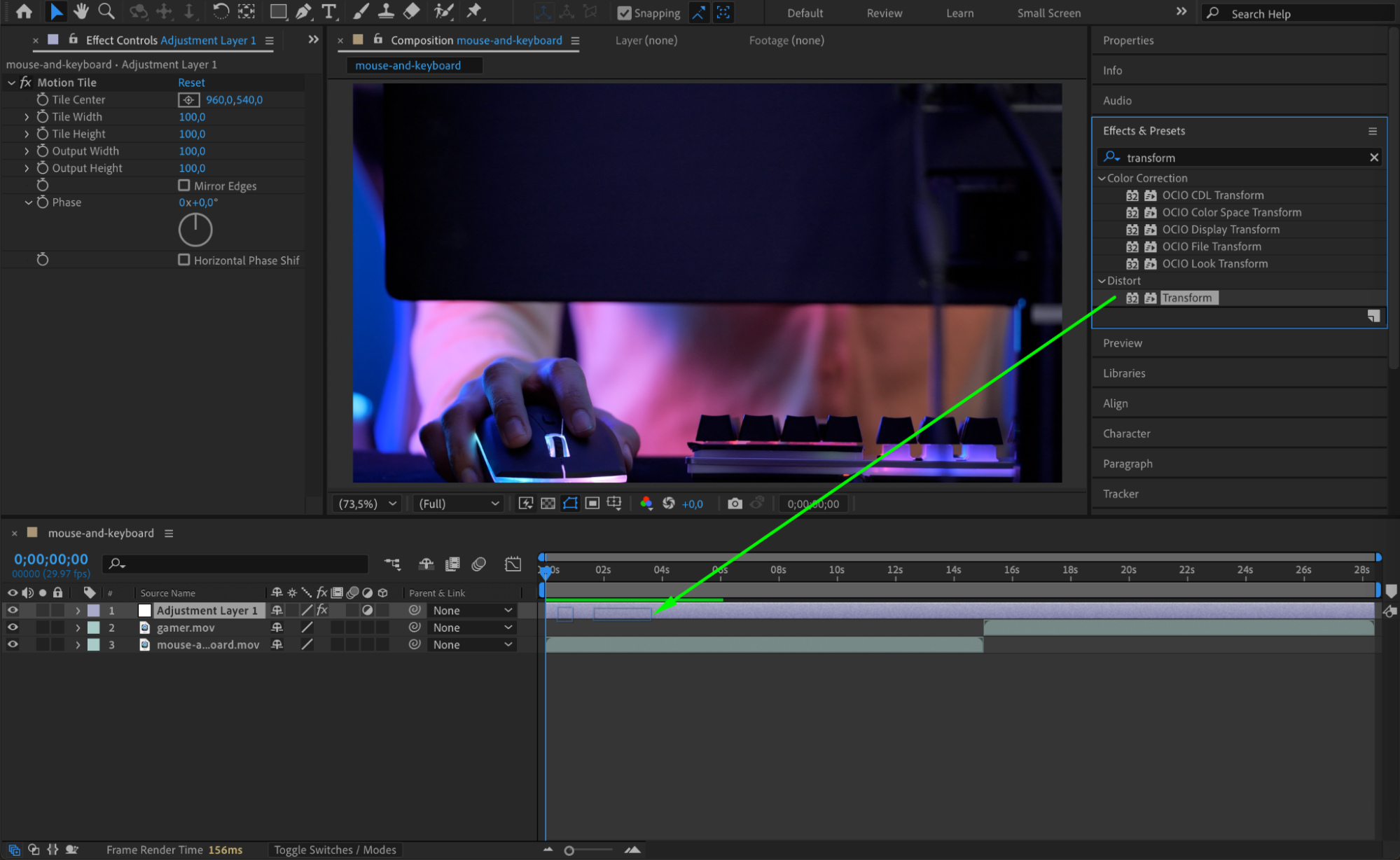 In the Effect Controls panel, search for the Motion Tile effect and apply it to the adjustment layer. This will allow the clip to tile, which helps smooth out the edges during the spin transition. Additionally, apply a Transform effect to enhance the control over the layer.