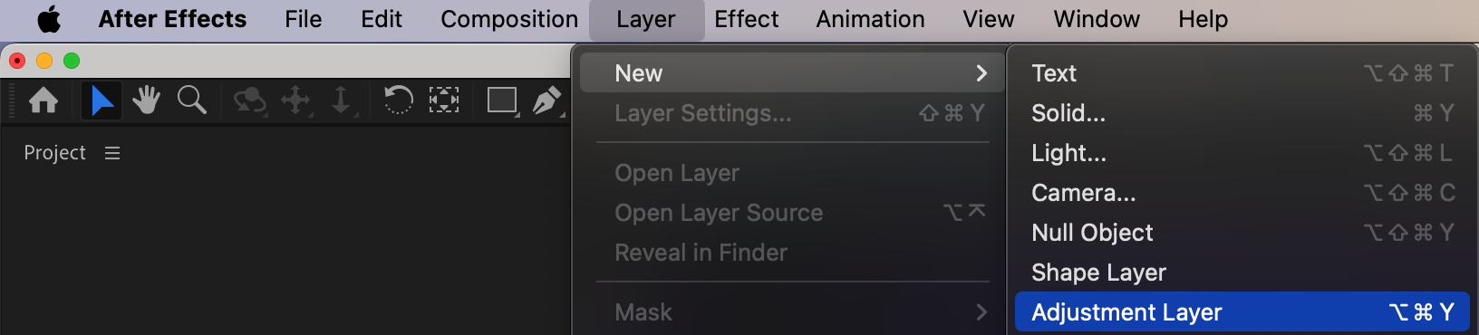 Navigate to Layer > New > Adjustment Layer. This adjustment layer will be used to control the effects that affect the transition between your video clips.