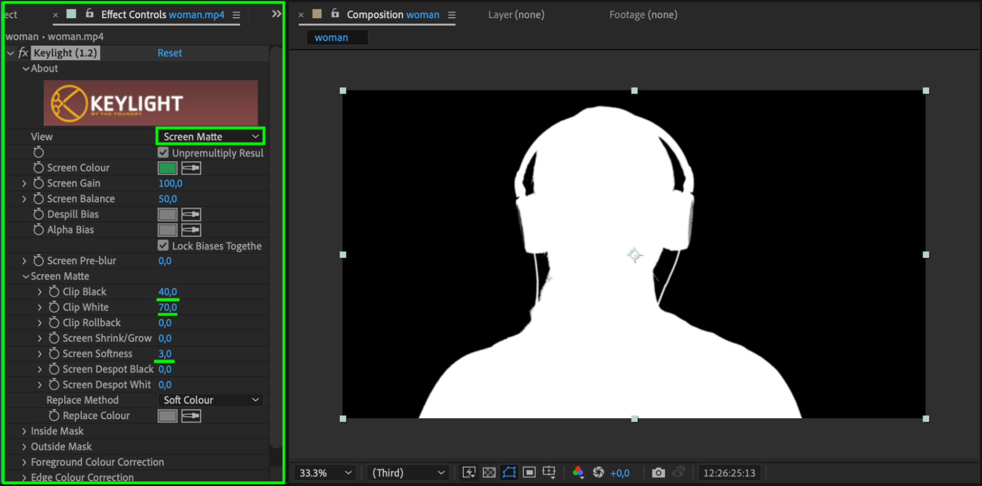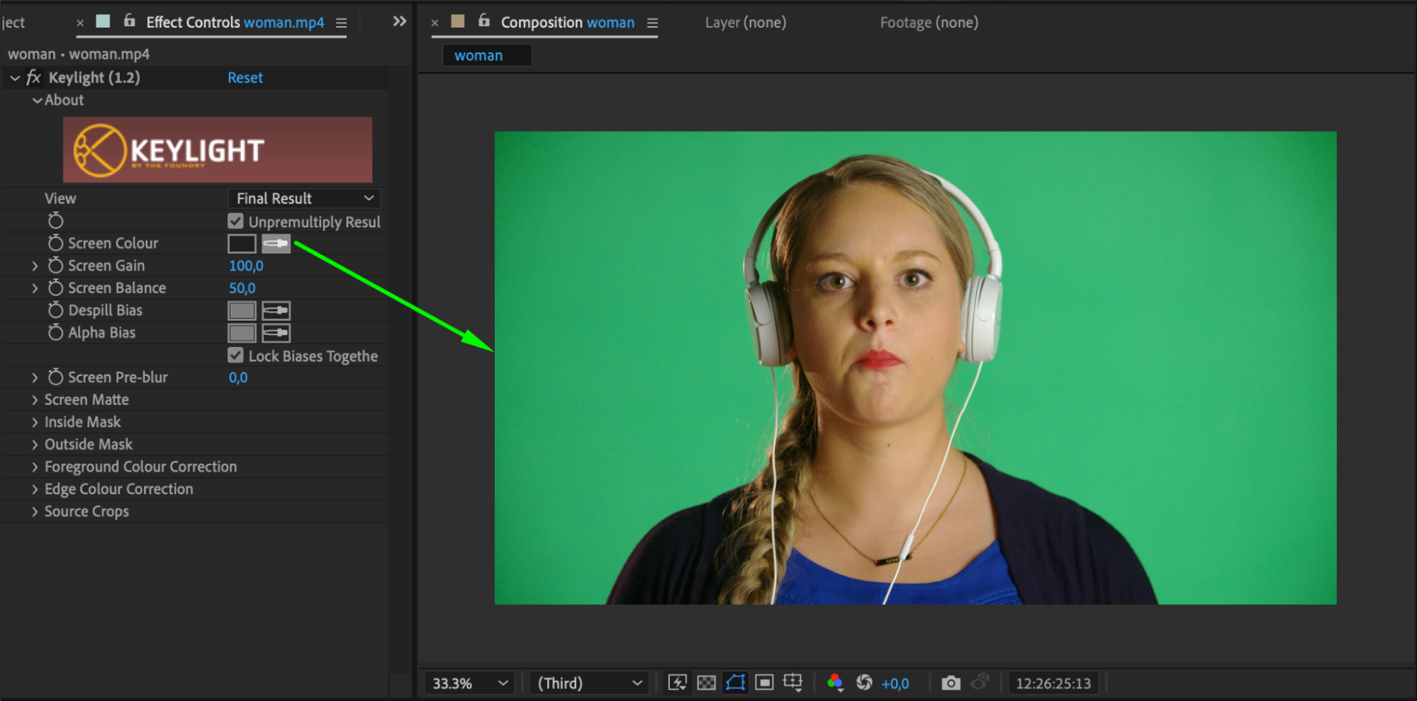 Once you’ve applied Keylight, use the Eyedropper tool in the Effect Controls panel to select the background color (typically green). Adjust the Keylight settings as follows: